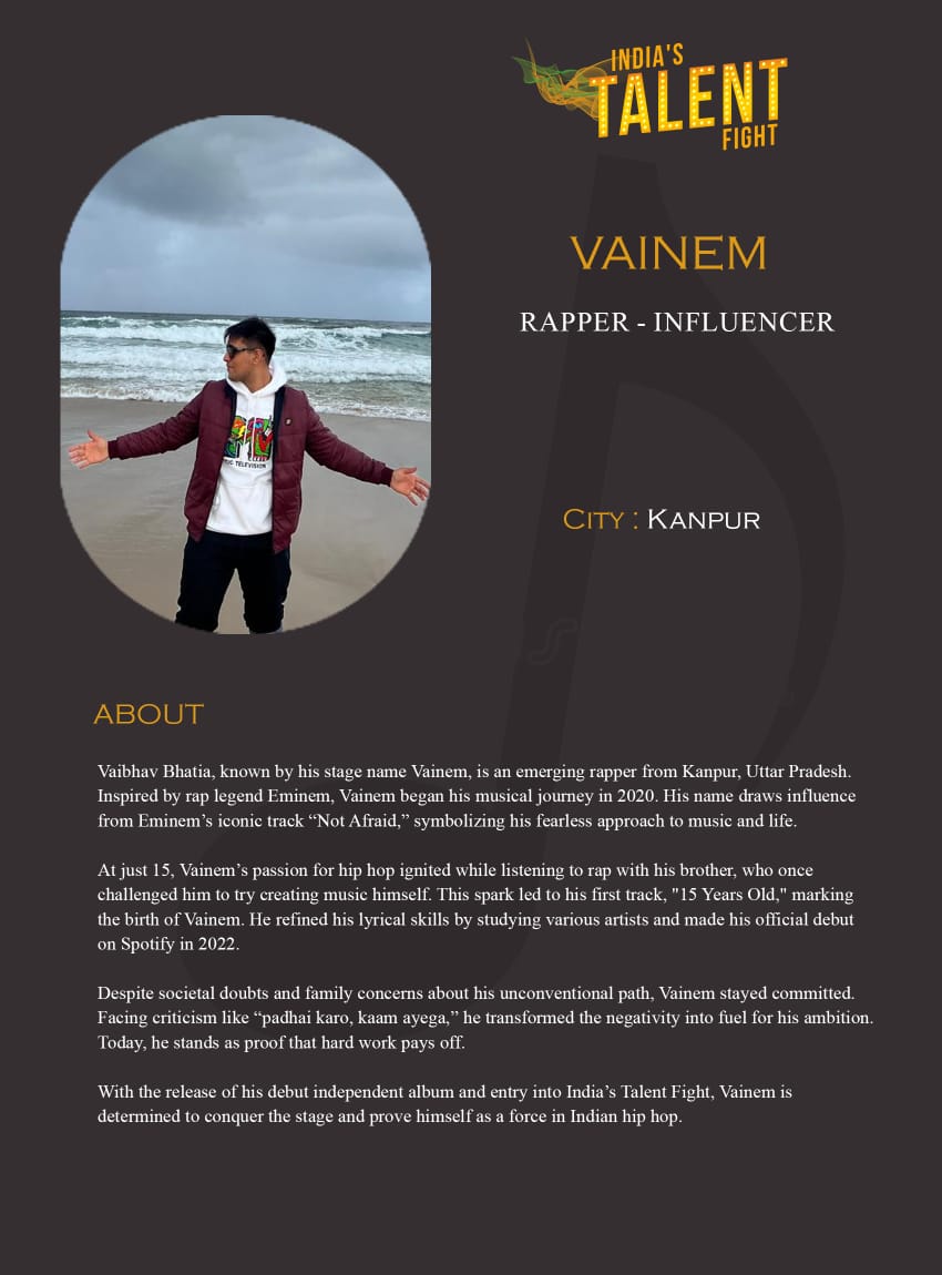 ITF Rapper VAINEM KanpurVaibhav Bhatia, known by his stage name Vainem, is an emerging rapper from Kanpur, Uttar Pradesh. Inspired by rap legend Eminem, Vainem began his musical journey in 2020. His name draws influence from Eminem’s iconic track “Not Afraid,” symbolizing his fearless approach to music and life.At just 15, Vainem’s passion for hip hop ignited while listening to rap with his brother, who once challenged him to try creating music himself. This spark
