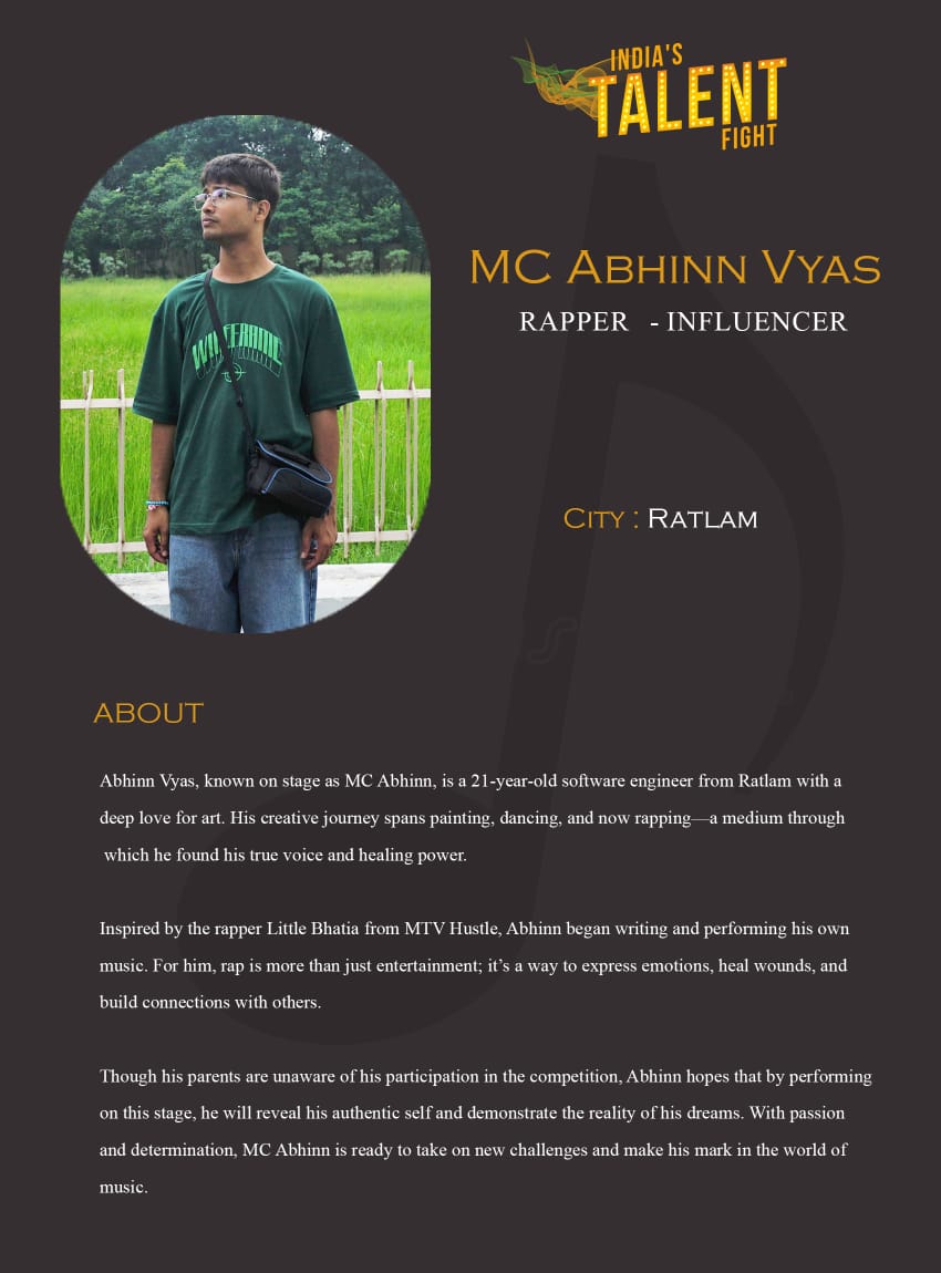 ITF Rapper MC Abhinn Vyas RatlamAbhinn Vyas, known on stage as MC Abhinn, is a 21-year-old software engineer from Ratlam with a deep love for art. His creative journey spans painting, dancing, and now rapping—a medium through which he found his true voice and healing power.Inspired by the rapper Little Bhatia from MTV Hustle, Abhinn began writing and performing his own music. For him, rap is more than just entertainment; it’s a way to express