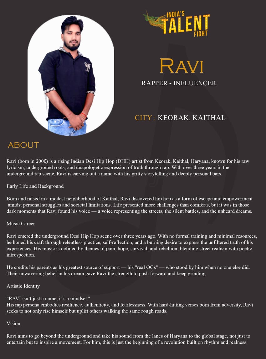 ITF Rapper Ravi (Keorak, Kaithal)Ravi (born in 2000) is a rising Indian Desi Hip Hop (DHH) artist from Keorak, Kaithal, Haryana, known for his raw lyricism, underground roots, and unapologetic expression of truth through rap. With over three years in the underground rap scene, Ravi is carving out a name with his gritty storytelling and deeply personal bars.Early Life and BackgroundBorn and raised in a modest neighborhood of Kaithal, Ravi discovered hip hop as a
