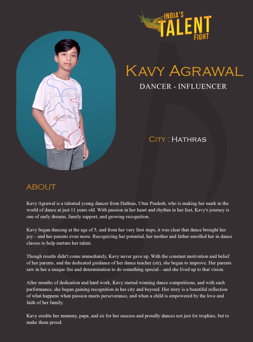 ITF Dancer Kavy Agrawal HathrasKavy Agrawal is a talented young dancer from Hathras, Uttar Pradesh, who is making her mark in the world of dance at just 11 years old. With passion in her heart and rhythm in her feet, Kavy’s journey is one of early dreams, family support, and growing recognition.Kavy began dancing at the age of 5, and from her very first steps, it was clear that dance brought her joy—and her parents