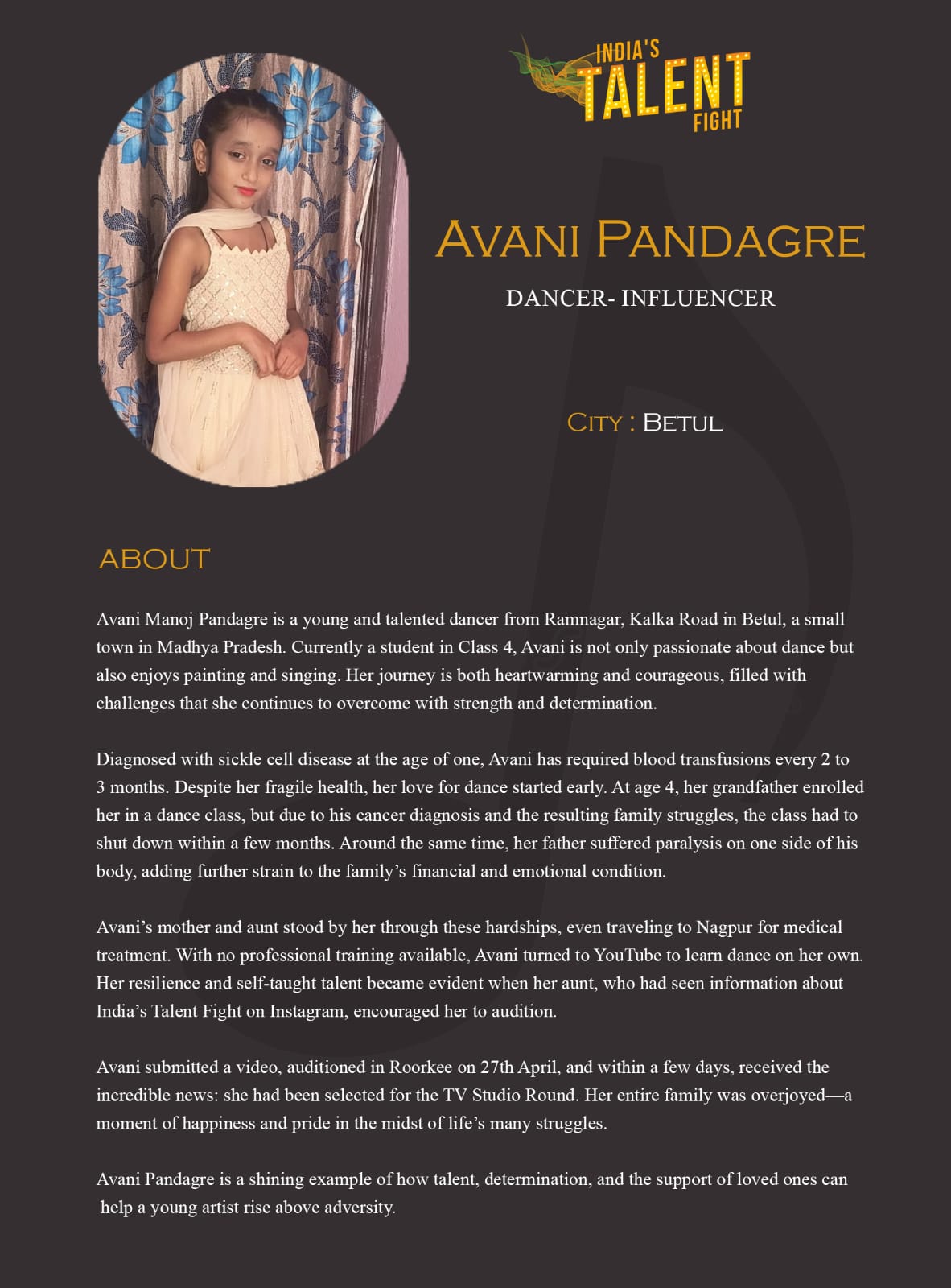 ITF Dancer Avani Manoj Pandagre BetulAvani Manoj Pandagre is a young and talented dancer from Ramnagar, Kalka Road in Betul, a small town in Madhya Pradesh. Currently a student in Class 4, Avani is not only passionate about dance but also enjoys painting and singing. Her journey is both heartwarming and courageous, filled with challenges that she continues to overcome with strength and determination.Diagnosed with sickle cell disease at the age of one, Avani has