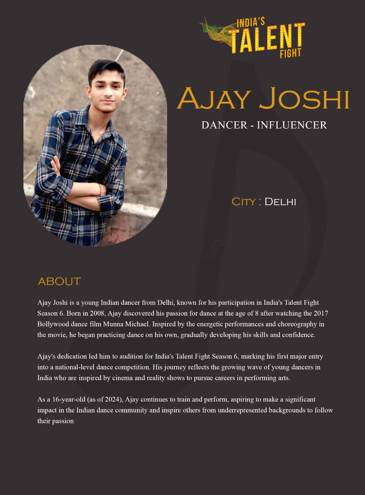 ITF Dancer Ajay Joshi DelhiBorn: 2008 | Nationality: Indian | Occupation: DancerBiographyAjay Joshi is a young Indian dancer from Delhi, known for his participation in India’s Talent Fight Season 6. Born in 2008, Ajay discovered his passion for dance at the age of 8 after watching the 2017 Bollywood dance film Munna Michael. Inspired by the energetic performances and choreography in the movie, he began practicing dance on his own, gradually developing his skills and