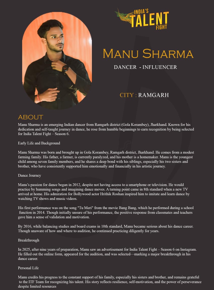ITF Dancer Manu Sharma RamgarhManu Sharma is an emerging Indian dancer from Ramgarh district (Gola Korambey), Jharkhand. Known for his dedication and self-taught journey in dance, he rose from humble beginnings to earn recognition by being selected for India Talent Fight – Season 6.Early Life and BackgroundManu Sharma was born and brought up in Gola Korambey, Ramgarh district, Jharkhand. He comes from a modest farming family. His father, a farmer, is currently paralyzed, and his