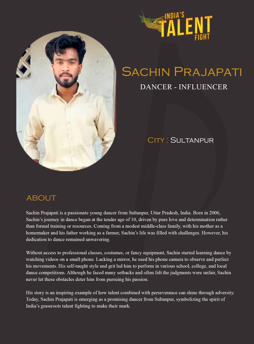 ITF Dancer Sachin Prajapati SultanpurSachin Prajapati is a passionate young dancer from Sultanpur, Uttar Pradesh, India. Born in 2006, Sachin’s journey in dance began at the tender age of 10, driven by pure love and determination rather than formal training or resources. Coming from a modest middle-class family, with his mother as a homemaker and his father working as a farmer, Sachin’s life was filled with challenges. However, his dedication to dance remained unwavering.Without access