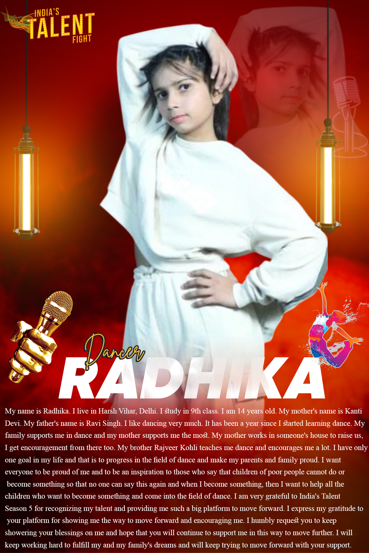 Dancer Radhika DelhiMy name is Radhika. I live in Harsh Vihar, Delhi. I study in 9th class. I am 14 years old. My mother’s name is Kanti Devi. My father’s name is Ravi Singh. I like dancing very much. It has been a year since I started learning dance. My family supports me in dance and my mother supports me the most. My mother works in someone’s house to raise us, I get encouragement from