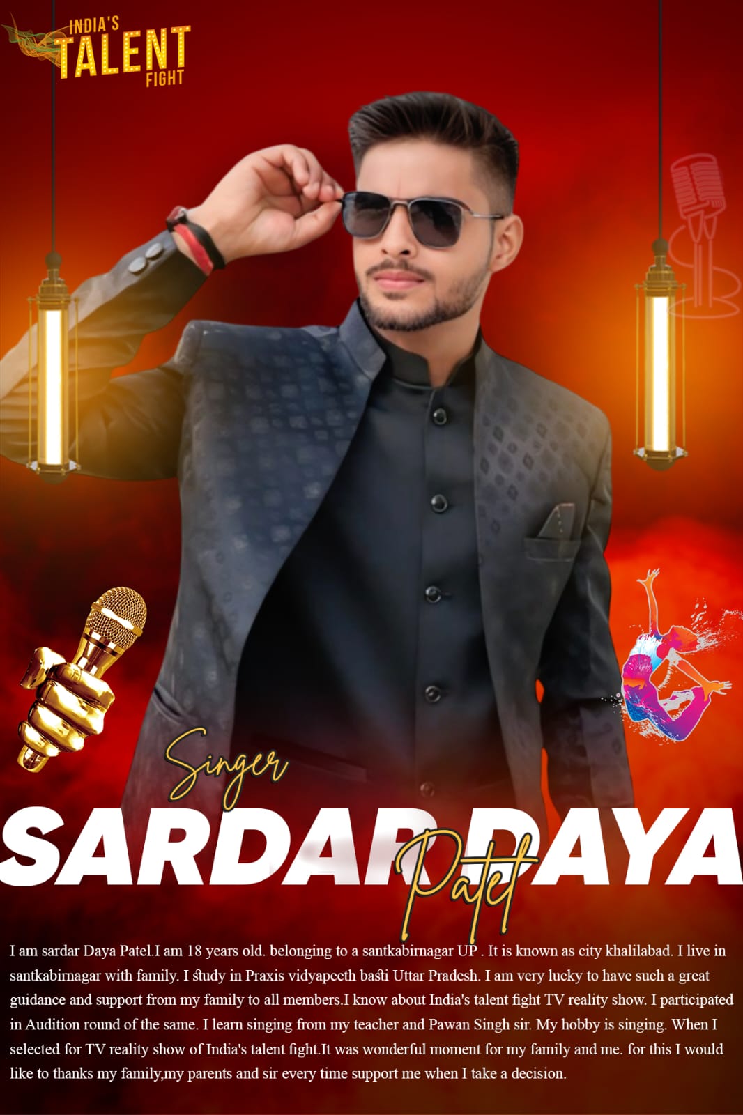 Singer Sardar Daya Patel SantkabirnagarI am sardar Daya Patel.I am 18 years old. belonging to a santkabirnagar UP . It is known as city khalilabad. I live in santkabirnagar with family. I study in Praxis vidyapeeth basti Uttar Pradesh. I am very lucky to have such a great guidance and support from my family to all members.I know about India’s talent fight TV reality show. I participated in Audition round of the same.I learn singing