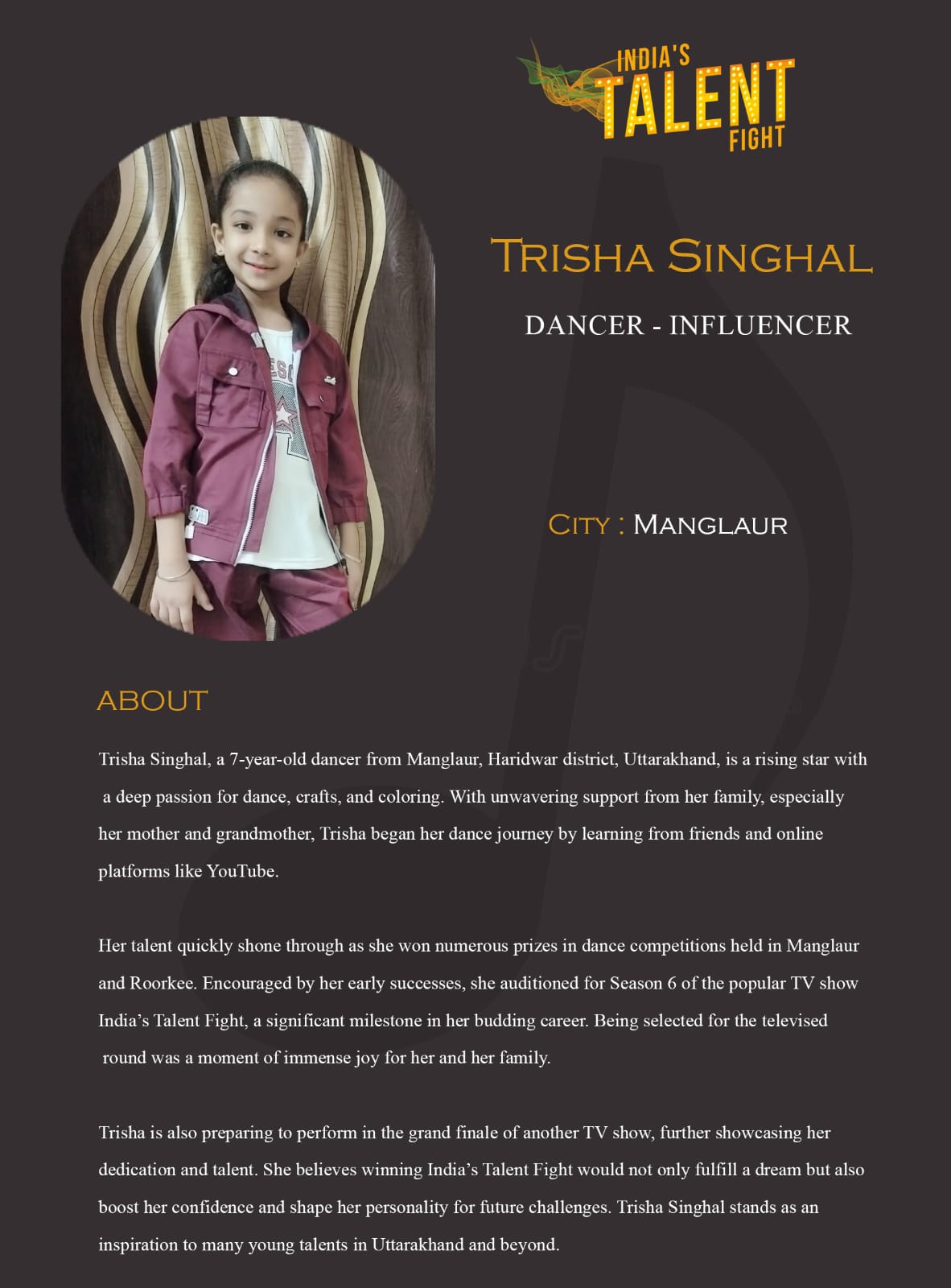 Dancer Trisha Singhal ManglaurTrisha Singhal, a 7-year-old dancer from Manglaur, Haridwar district, Uttarakhand, is a rising star with a deep passion for dance, crafts, and coloring. With unwavering support from her family, especially her mother and grandmother, Trisha began her dance journey by learning from friends and online platforms like YouTube.Her talent quickly shone through as she won numerous prizes in dance competitions held in Manglaur and Roorkee. Encouraged by her early successes, she auditioned