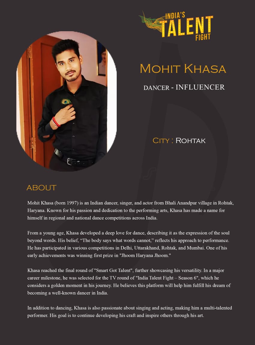 ITF Dancer Mohit Khasa RohtakMohit Khasa (born 1997) is an Indian dancer, singer, and actor from Bhali Anandpur village in Rohtak, Haryana. Known for his passion and dedication to the performing arts, Khasa has made a name for himself in regional and national dance competitions across India.From a young age, Khasa developed a deep love for dance, describing it as the expression of the soul beyond words. His belief, “The body says what words cannot,”
