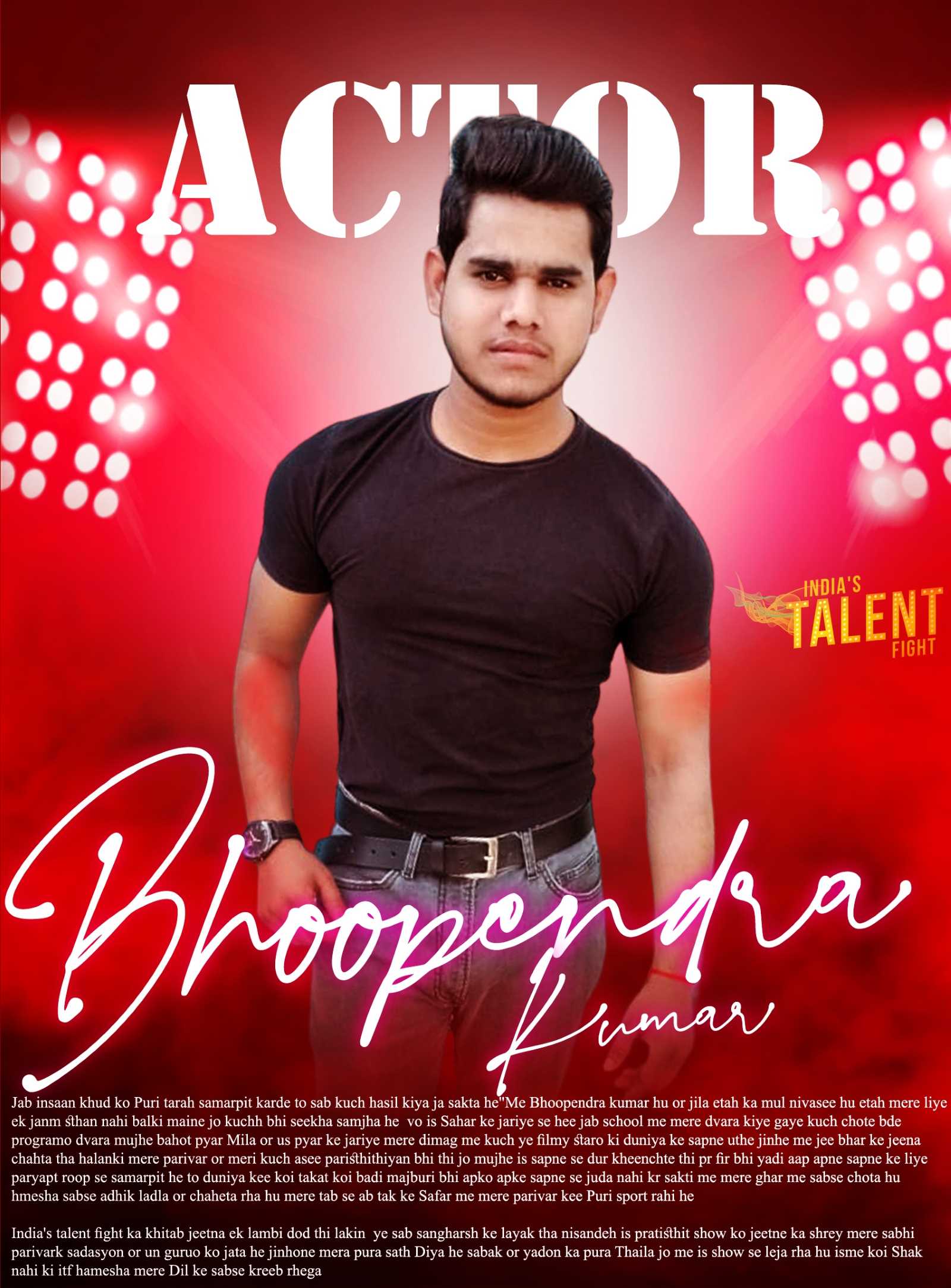 ACTOR BHOOPENDRA KUMAR ETAHJab insaan khud ko Puri tarah samarpit karde to sab kuch hasil kiya ja sakta he”Me Bhoopendra kumar hu or jila etah ka mul nivasee hu etah mere liye ek janm sthan nahi balki maine jo kuchh bhi seekha samjha he vo is Sahar ke jariye se hee jab school me mere dvara kiye gaye kuch chote bde programo dvara mujhe bahot pyar Mila or us pyar ke jariye mere dimag me