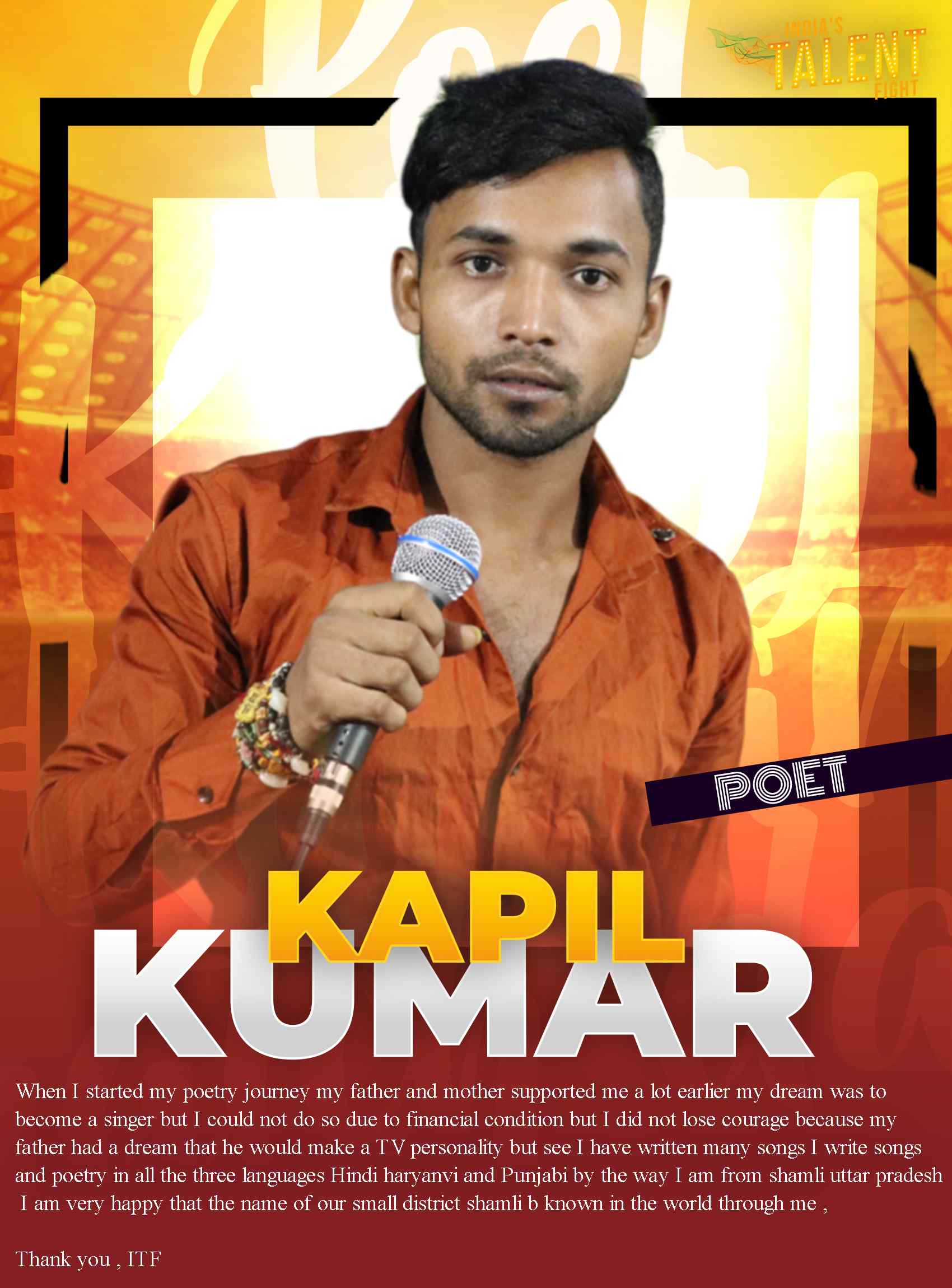 ITF POET KAPIL KUMAR SHAMLIKapil Kumar My introduction to the magazine 👉🏻 when I started my poetry journey my father and mother supported me a lot earlier my dream was to become a singer but I could not do so due to financial condition but I did not lose courage because my father had a dream that he would make a TV personality but see I have written many songs I write songs and poetry