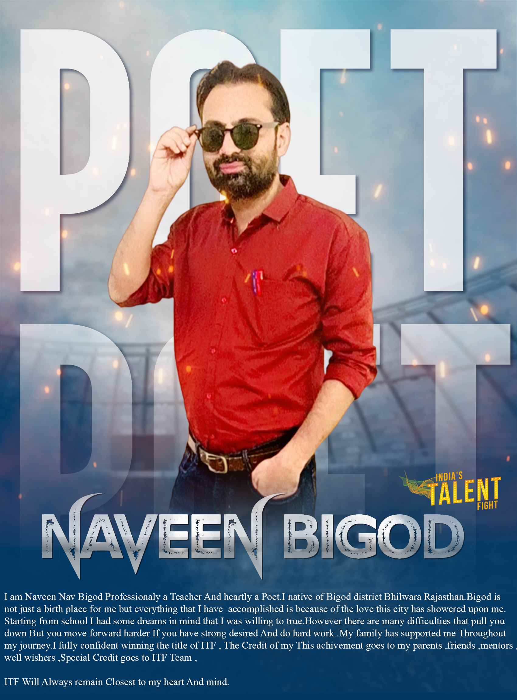 ITF POET NAVEEN BIGOD RAJASTHANEverything is possibleEverything is possible in this world When a person hard determined and do hard work.I am Naveen Nav Bigod Professionaly a Teacher And heartly a Poet.I native of Bigod district Bhilwara Rajasthan.Bigod is not just a birth place for me but everything that I have accomplished is because of the love this cityhas showered upon me.Starting from school I had some dreams in mind that I was willing to
