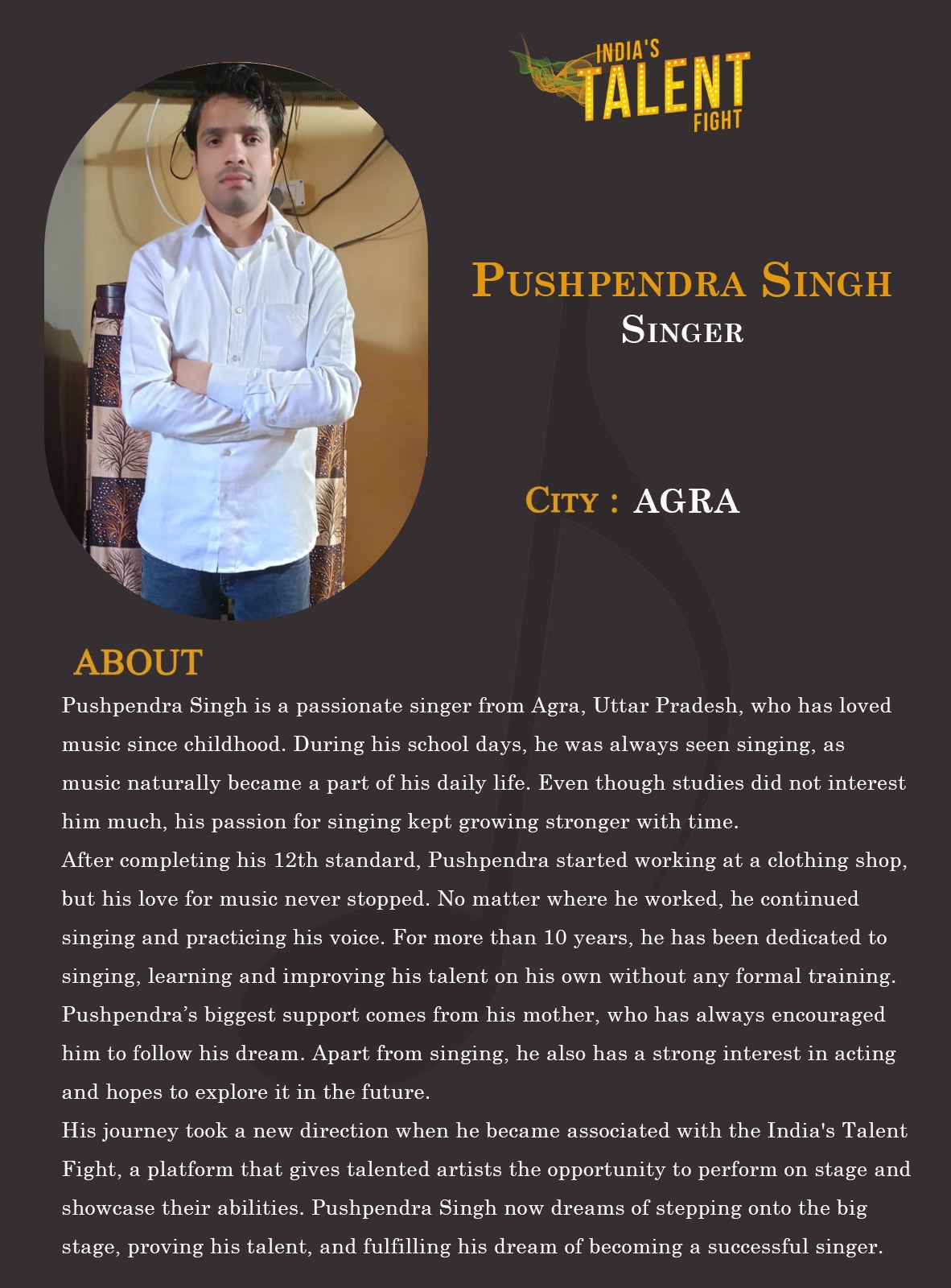 ITF Singer Pushpendra Singh AgraPushpendra Singh is a passionate singer from Agra, Uttar Pradesh, who has loved music since childhood. During his school days, he was always seen singing, as music naturally became a part of his daily life. Even though studies did not interest him much, his passion for singing kept growing stronger with time.After completing his 12th standard, Pushpendra started working at a clothing shop, but his love for music never stopped. No