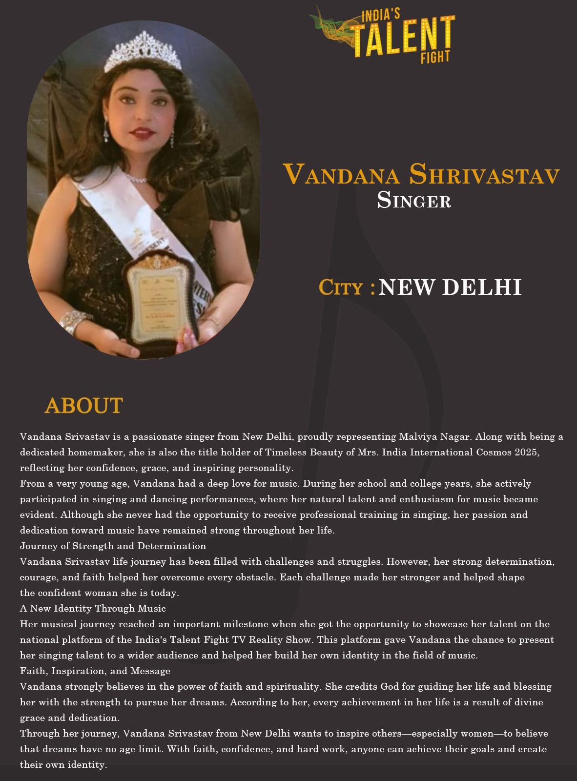ITF Vandana Shrivastav singer new delhiVandana Srivastava is a passionate singer from New Delhi, proudly representing Malviya Nagar. Along with being a dedicated homemaker, she is also the title holder of Timeless Beauty of Mrs. India International Cosmos 2025, reflecting her confidence, grace, and inspiring personality.From a very young age, Vandana had a deep love for music. During her school and college years, she actively participated in singing and dancing performances, where her natural talent