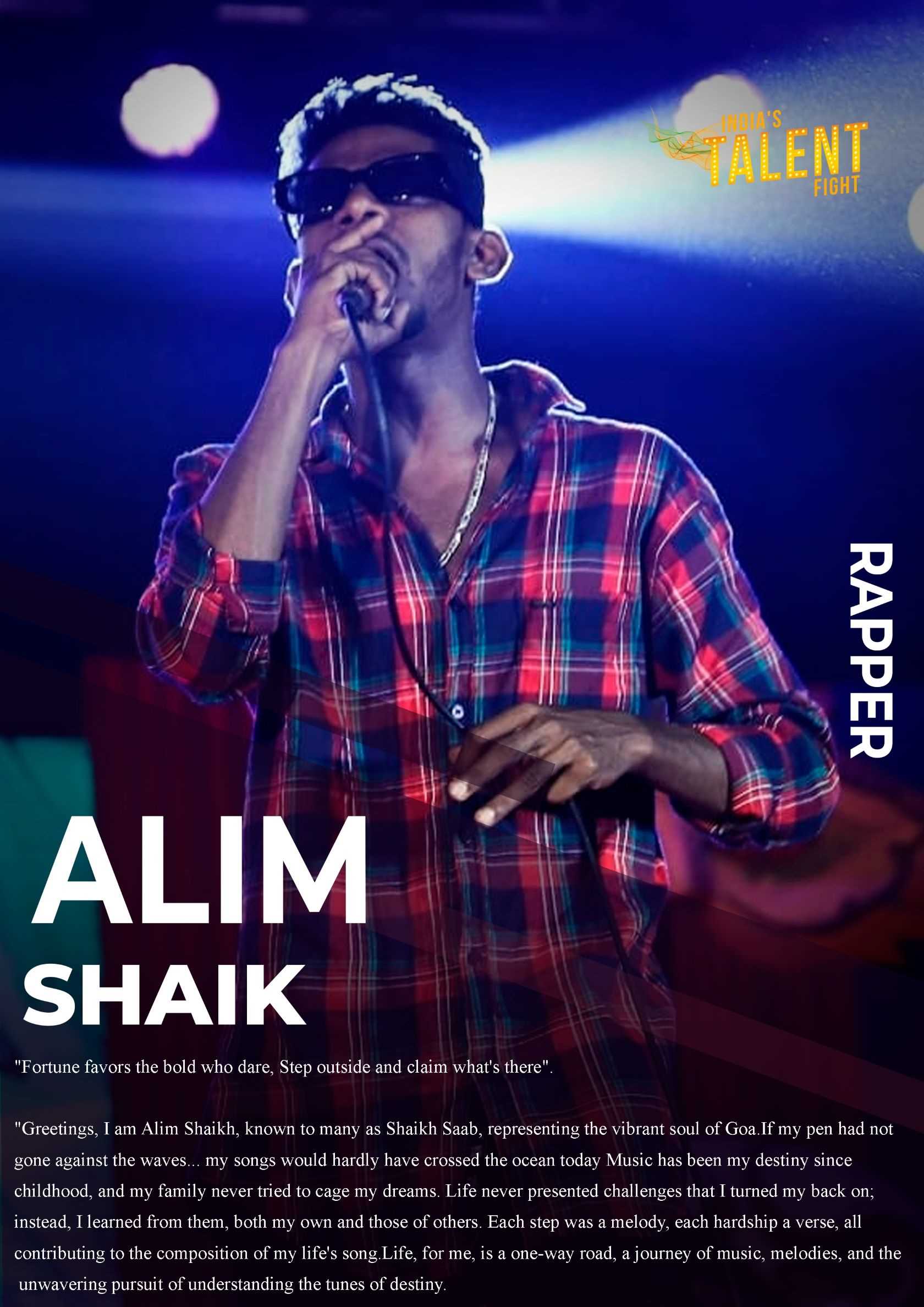 RAPPER ALIM SHAIK GOA“Fortune favors the bold who dare,Step outside and claim what’s there”.“Greetings, I am Alim Shaikh, known to many as Shaikh Saab, representing the vibrant soul of Goa.If my pen had not gone against the waves… my songs would hardly have crossed the ocean todayMusic has been my destiny since childhood, and my family never tried to cage my dreams.Life never presented challenges that I turned my back on; instead, I learned from