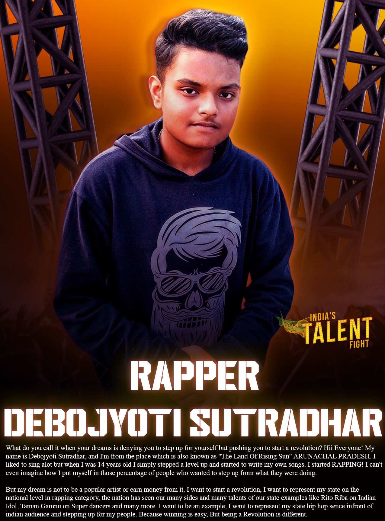 RAPPER DEBOJYOTI SUTRADHAR NAHARLAGUN ARUNACHAL PRADESHWhat do you call it when your dreams is denying you to step up for yourself but pushing you to start a revolution? Hii Everyone! My name is Debojyoti Sutradhar, and I’m from the place which is also known as “The Land Of Rising Sun” ARUNACHAL PRADESH. I liked to sing alot but when I was 14 years old I simply stepped a level up and started to write my