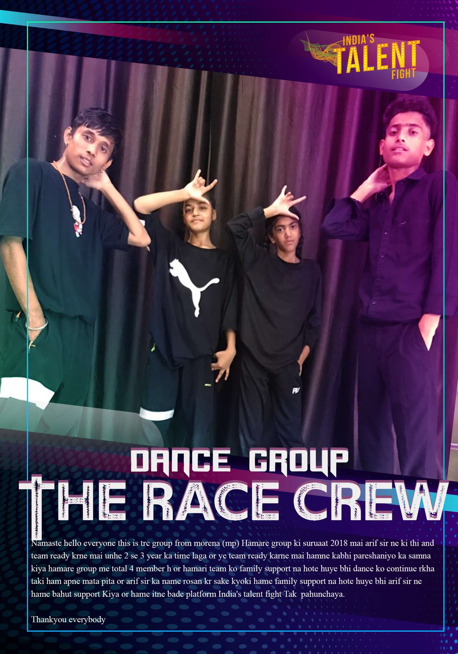 DANCER GROUP THE RACE CREW MORENANamaste hello everyone this is trc group from morena (mp)Hamare group ki suruaat 2018 mai arif sir ne ki thi and team ready krne mai unhe 2 se 3 year ka time laga or ye team ready karne mai hamne kabhi pareshaniyo ka samna kiya hamare group me total 4 member h or hamari team ko family support na hote huye bhi dance ko continue rkha taki ham apne mata