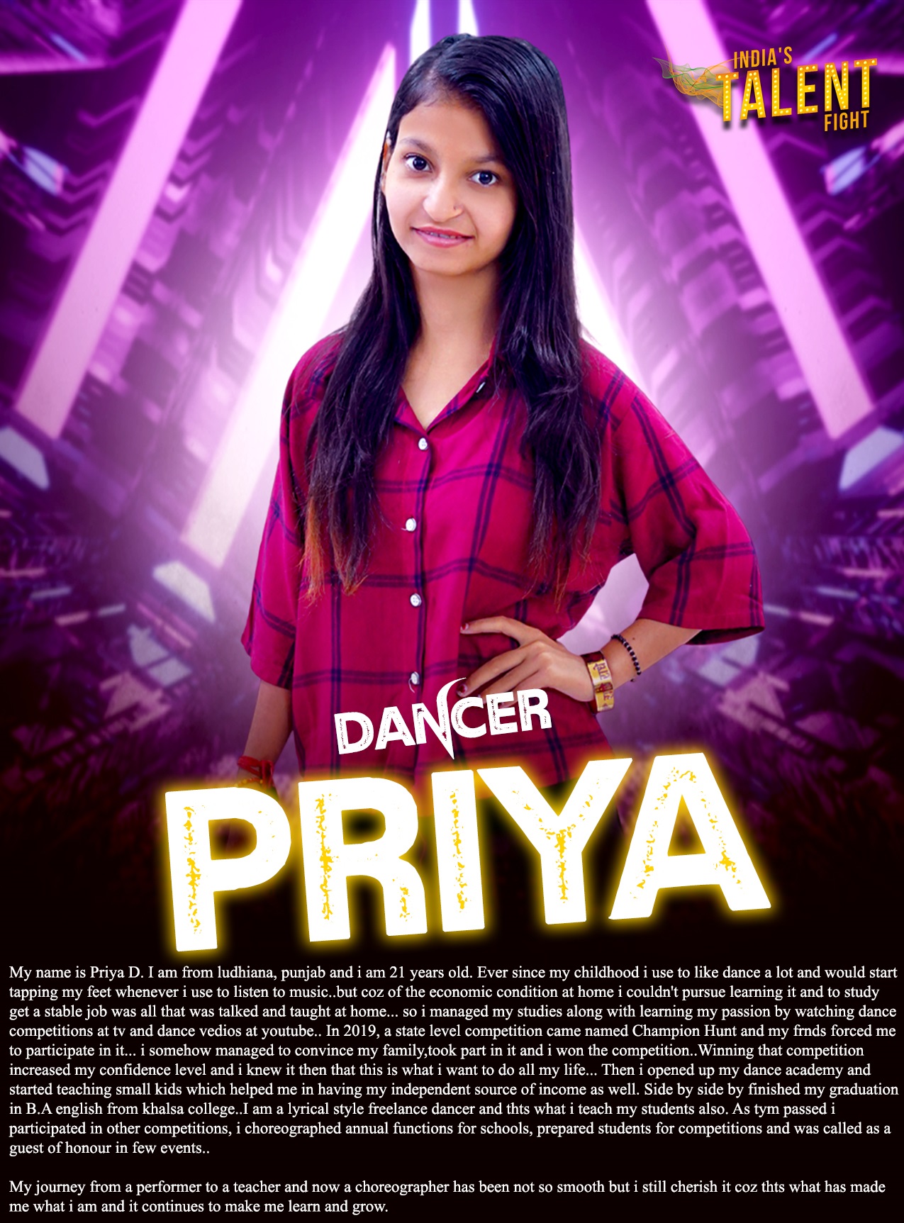 DANCER PRIYA LUDHIANAMy name is Priya D. I am from ludhiana, punjab and i am 21 years old.Ever since my childhood i use to like dance a lot and would start tapping my feet whenever i use to listen to music..but coz of the economic condition at home i couldn’t pursue learning it and to study get a stable job was all that was talked and taught at home… so i managed my studies along
