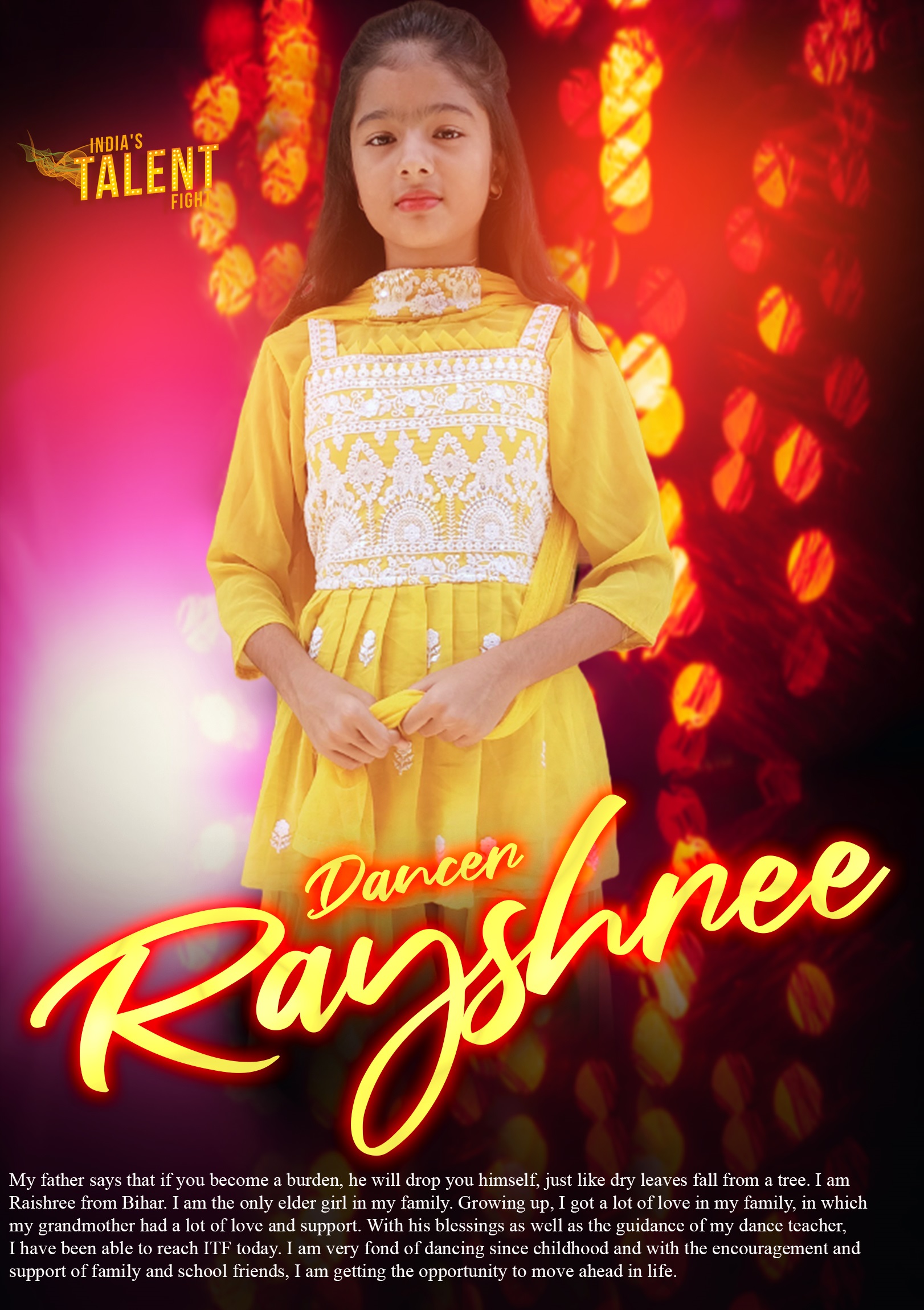 DANCER RAYSHREE BIKRAMGANJMy father says that if you become a burden, he will drop you himself, just like dry leaves fall from a tree. I am Raishree from Bihar. I am the only elder girl in my family. Growing up, I got a lot of love in my family, in which my grandmother had a lot of love and support. With his blessings as well as the guidance of my dance teacher, I have been