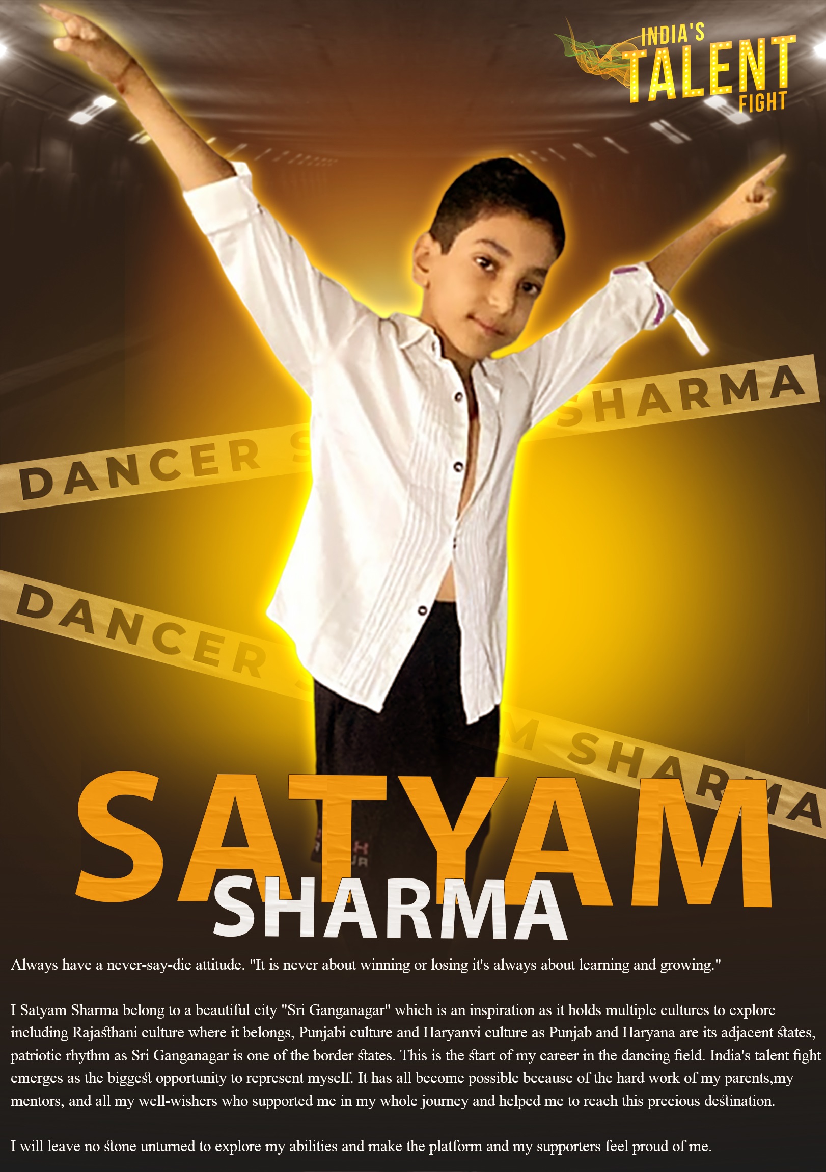 DANCER SATYAM SHARMA SRIGANGANAGARAlways have a never-say-die attitude“It is never about winning or losing it’s always about learning and growing.”I Satyam Sharma belong to a beautiful city“Sri Ganganagar” which is an inspirationas it holds multiple cultures to exploreincluding Rajasthani culture where itbelongs, Punjabi culture and Haryanviculture as Punjab and Haryana are itsadjacent states, patriotic rhythm asSri Ganganagar is one of the borderstates.This is the start of my career in thedancing field. India’s talent fight emergesas