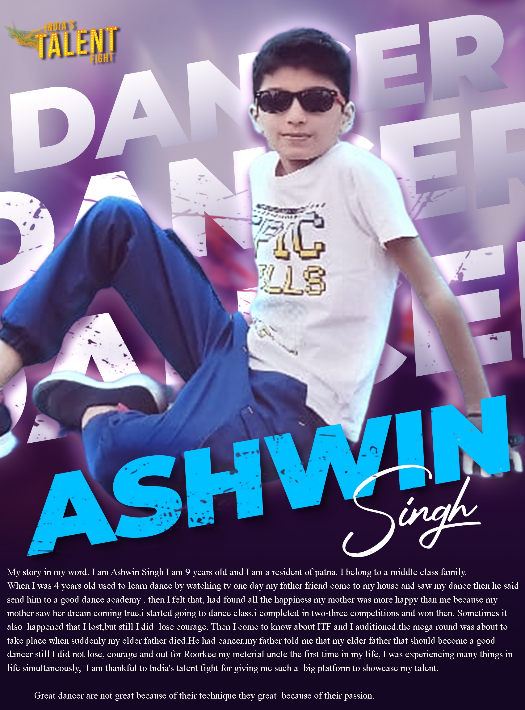 DANCER ASHWIN SINGH PATNAMy story in my wordI am Ashwin Singh I am 9 years old and I am a resident of patnaI belong to a middle class family.When I was 4 years old used to learn dance by watching tv one day my father friend come to my house and saw my dance then he said send him to a good dance academy . then I felt that, had found all the happiness my