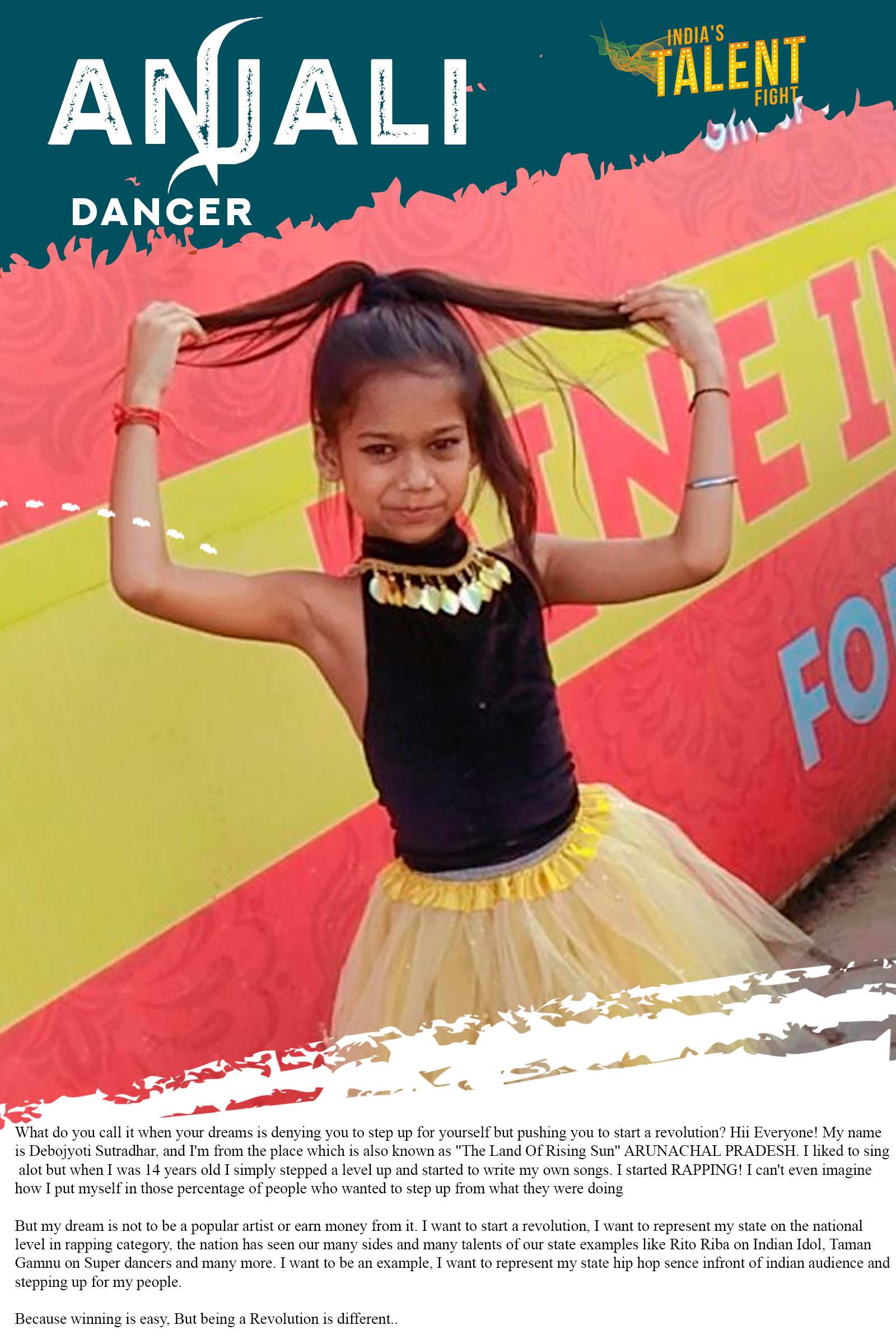 DANCER ANJALI PANIPATWhat do you call it when your dreams is denying you to step up for yourself but pushing you to start a revolution? Hii Everyone! My name is Debojyoti Sutradhar, and I’m from the place which is also known as “The Land Of Rising Sun” ARUNACHAL PRADESH. I liked to sing alot but when I was 14 years old I simply stepped a level up and started to write my own songs. I