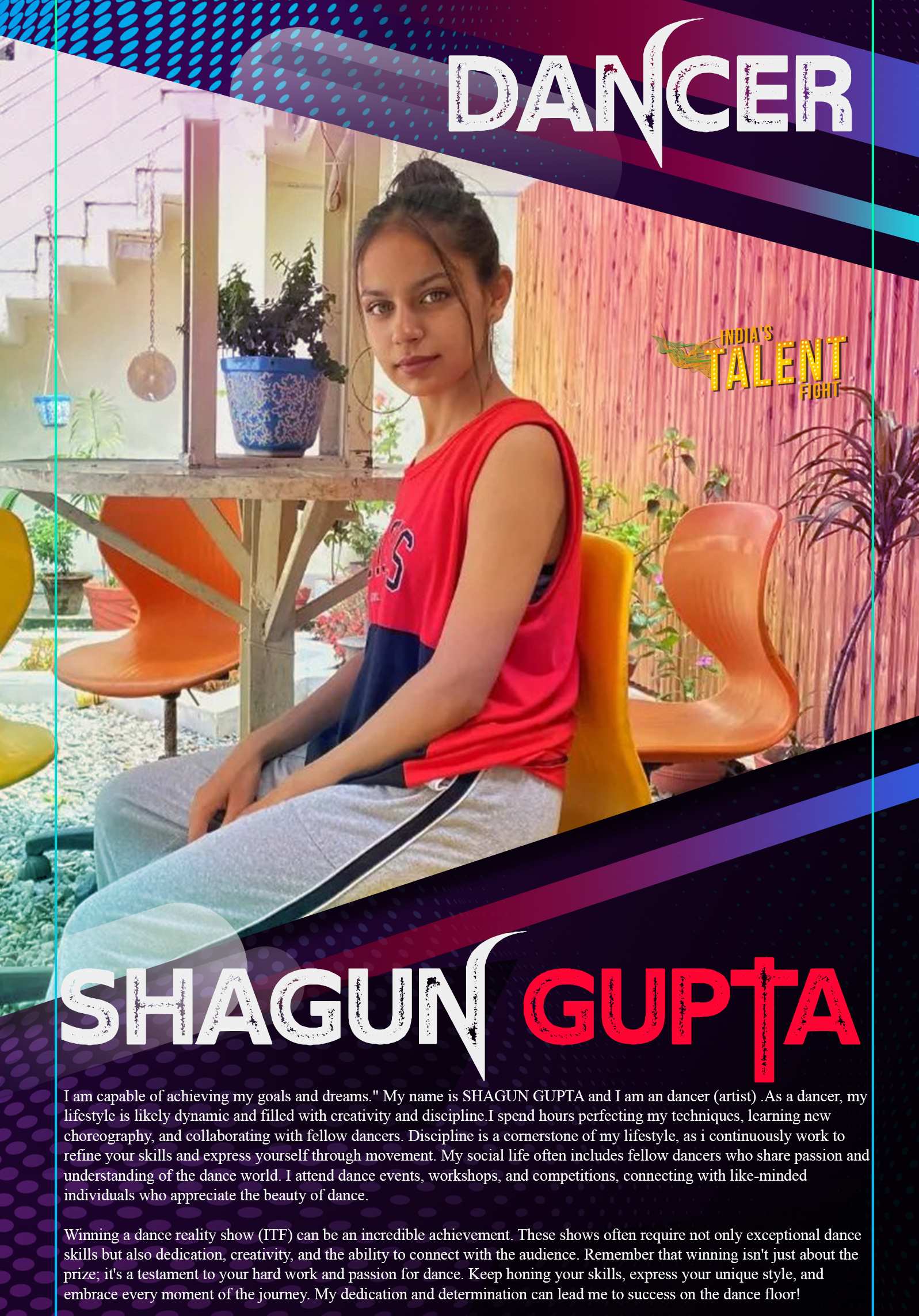 DANCER SHAGUN GUPTA DEHRADUNI am capable of achieving my goals and dreams.” My name is SHAGUN GUPTA and I am an dancer (artist) .As a dancer, my lifestyle is likely dynamic and filled with creativity and discipline.I spend hours perfecting my techniques, learning new choreography, and collaborating with fellow dancers. Discipline is a cornerstone of my lifestyle, as i continuously work to refine your skills and express yourself through movement. My social life often includes
