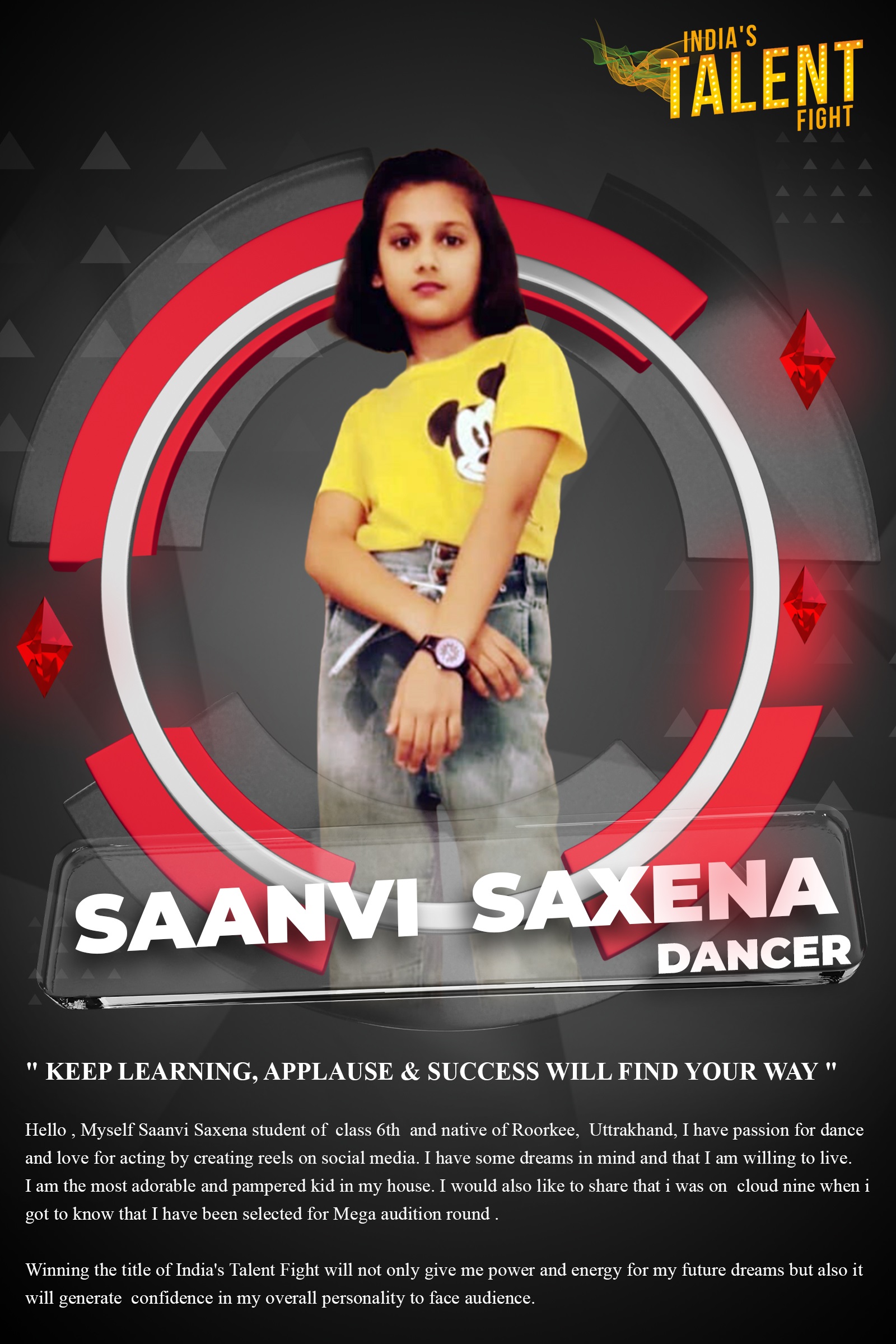 DANCER SAANVI SAXENA ROORKEE” KEEP LEARNING, APPLAUSE & SUCCESS WILL FIND YOUR WAY “Hello , Myself Saanvi Saxena student of class 6thand native of Roorkee, Uttrakhand, I have passion for dance and love for acting by creating reels on social media. I have some dreams in mind and that I am willing to live. I am the most adorable and pampered kid in my house. I would also like to share that i was on