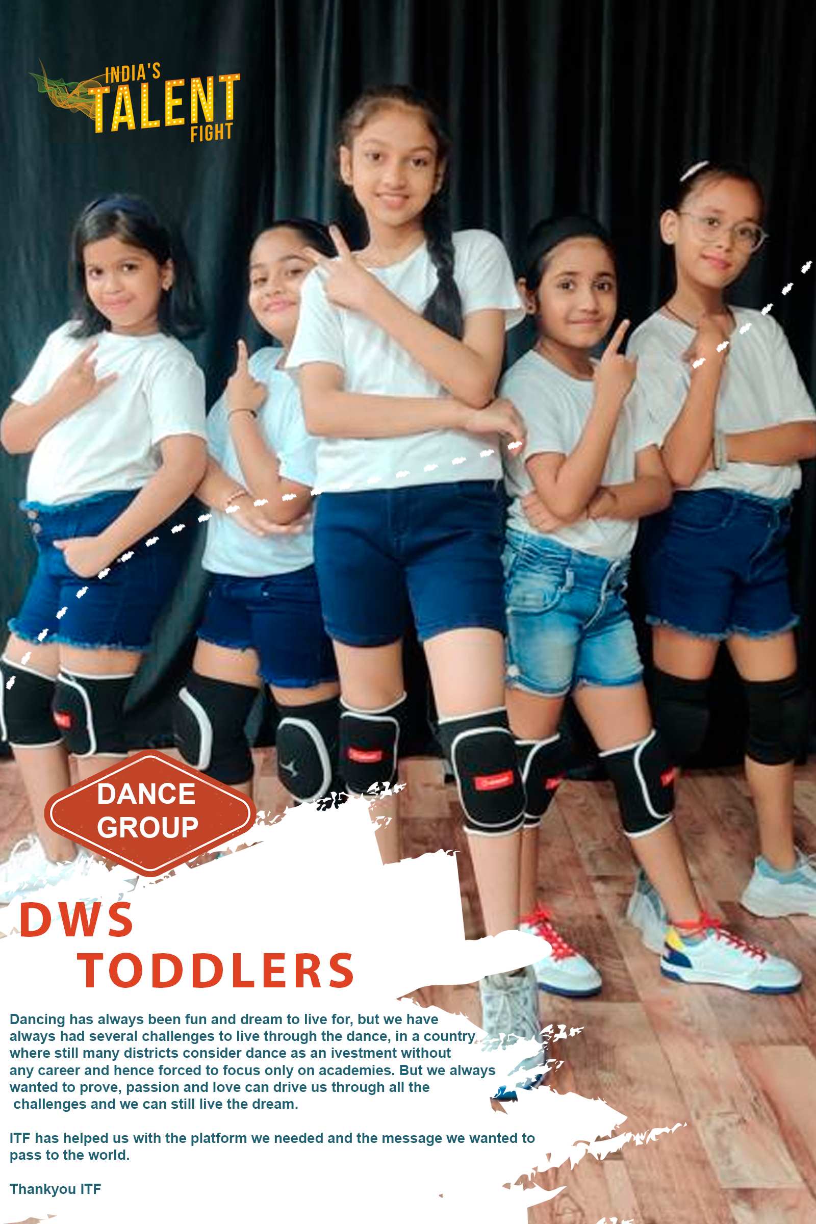 GROUP DANCE DWS TODDLERS DOMBIVLI MUMBAIDancing has always been fun and dream to live for, but we have always had several challenges to live through the dance, in a country where still many districts consider dance as an ivestment without any career and hence forced to focus only on academies. But we always wanted to prove, passion and love can drive us through all the challenges and we can still live the dream.ITF has helped
