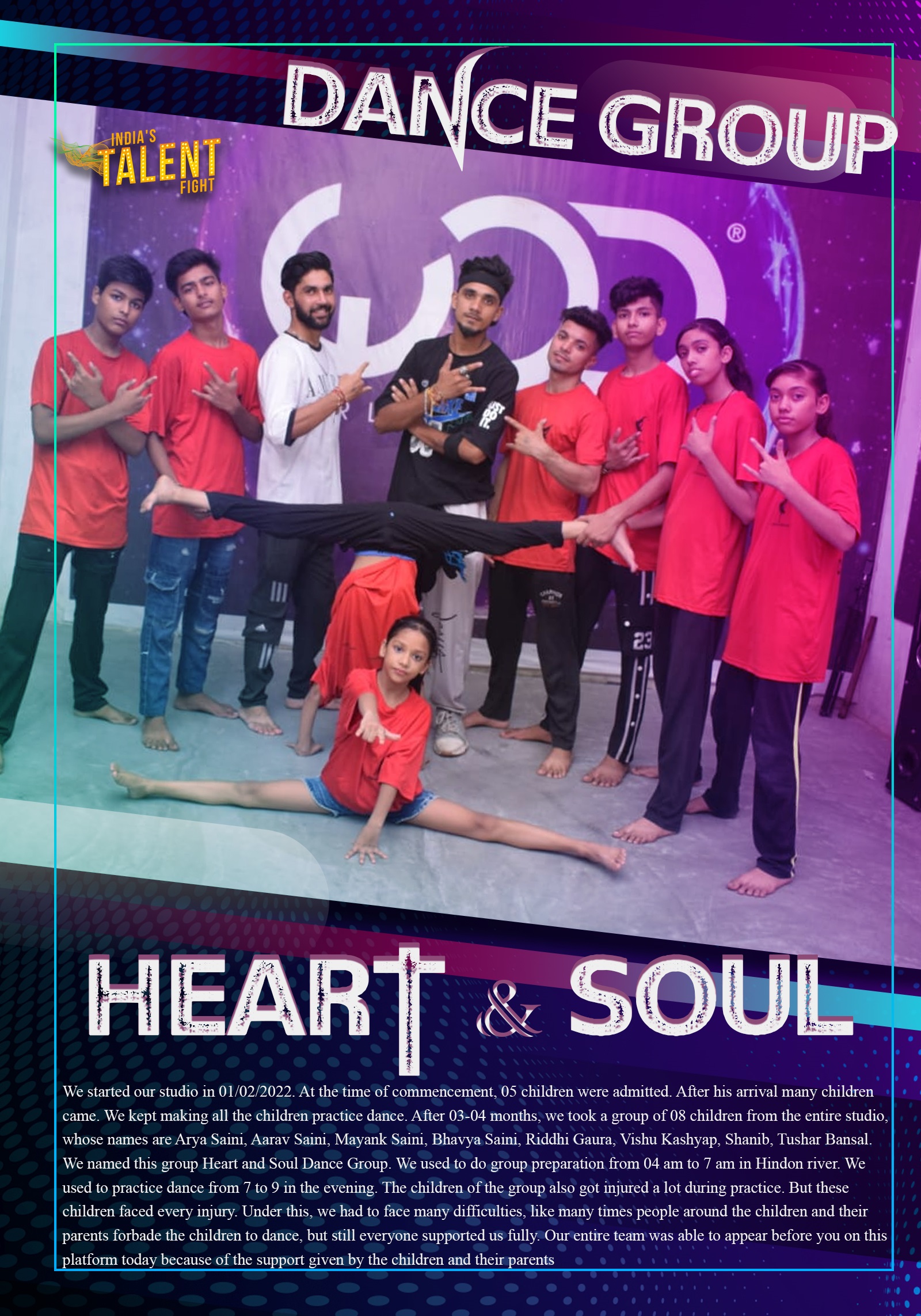 DANCE GROUP HEART & SOUL CHHUTMALPUR SAHARANPURWe started our studio in 01/02/2022. At the time of commencement,05 children were admitted. After his arrival many children came. Wekept making all the children practice dance. After 03-04 months, wetook a group of 08 children from the entire studio, whose names areArya Saini, Aarav Saini, Mayank Saini, Bhavya Saini, Riddhi Gaura, VishuKashyap, Shanib, Tushar Bansal. We named this group Heart and SoulDance Group. We used to do group