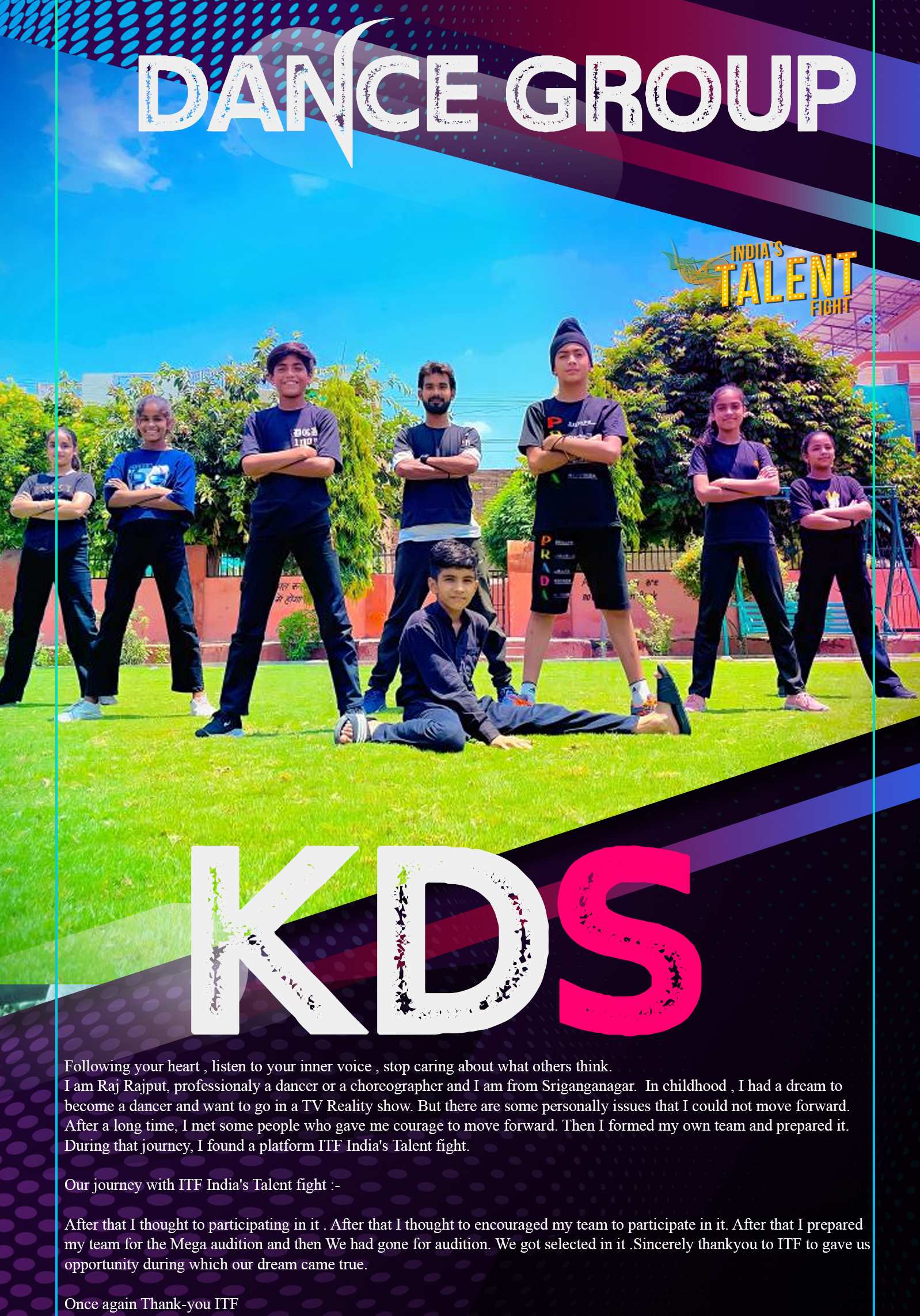 KDS DANCE GROUP SRIGANGANAGARFollowing your heart , listen to your inner voice , stop caring about what others think.I am Raj Rajput, professionaly a dancer or a choreographer and I am from Sriganganagar. In childhood , I had a dream to become a dancer and want to go in a TV Reality show. But there are some personally issues that I could not move forward. After a long time, I met some people who gave