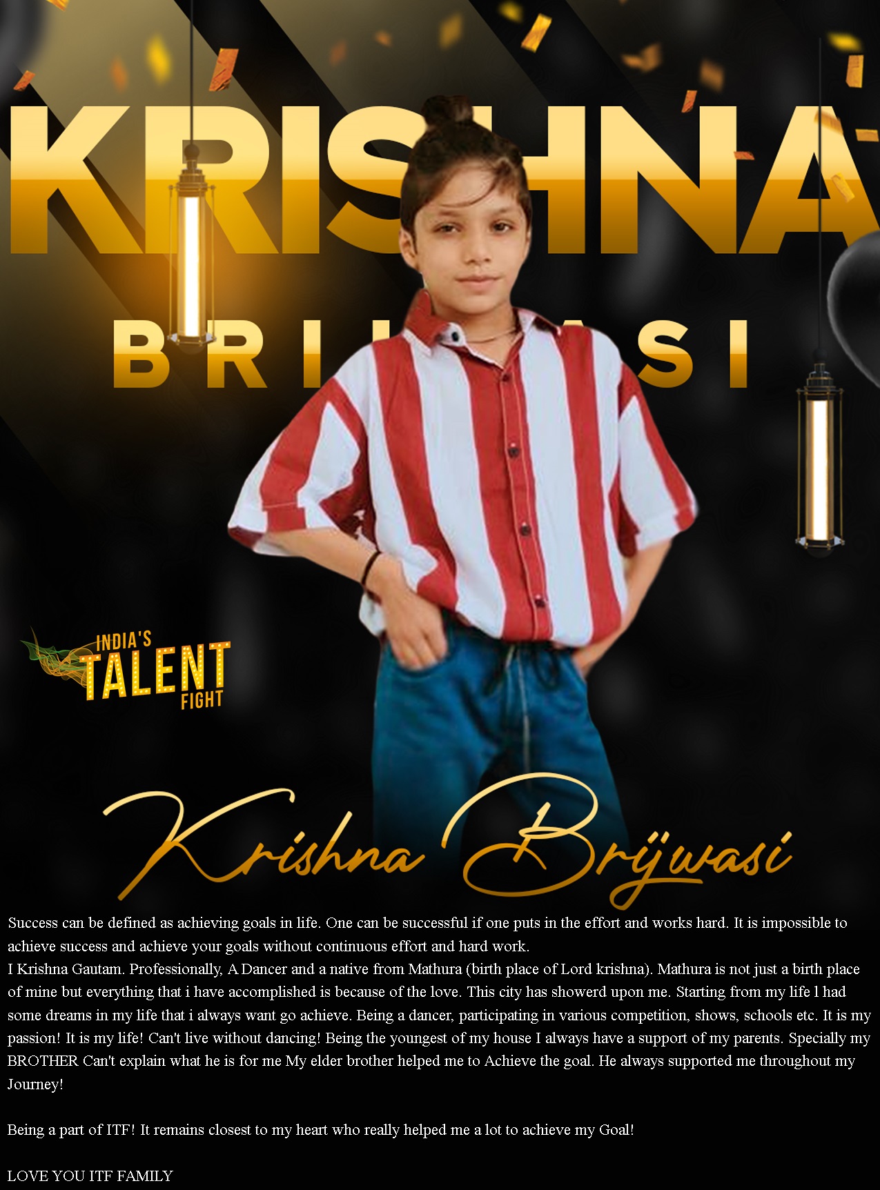 DANCER KRISHNA BRIJWASI MATHURATODAY IS YOUR OPPORTUNITY TO BUILD THE TOMORROW YOU WANTI NEVER LOOSESuccess can be defined as achieving goals in life. One can be successful if one puts in the effort and works hard. It is impossible to achieve success and achieve your goals without continuous effort and hard work.I Krishna Gautam.Professionally, A Dancer and a native from Mathura (birth place of Lord krishna).Mathura is not just a birth place of mine but