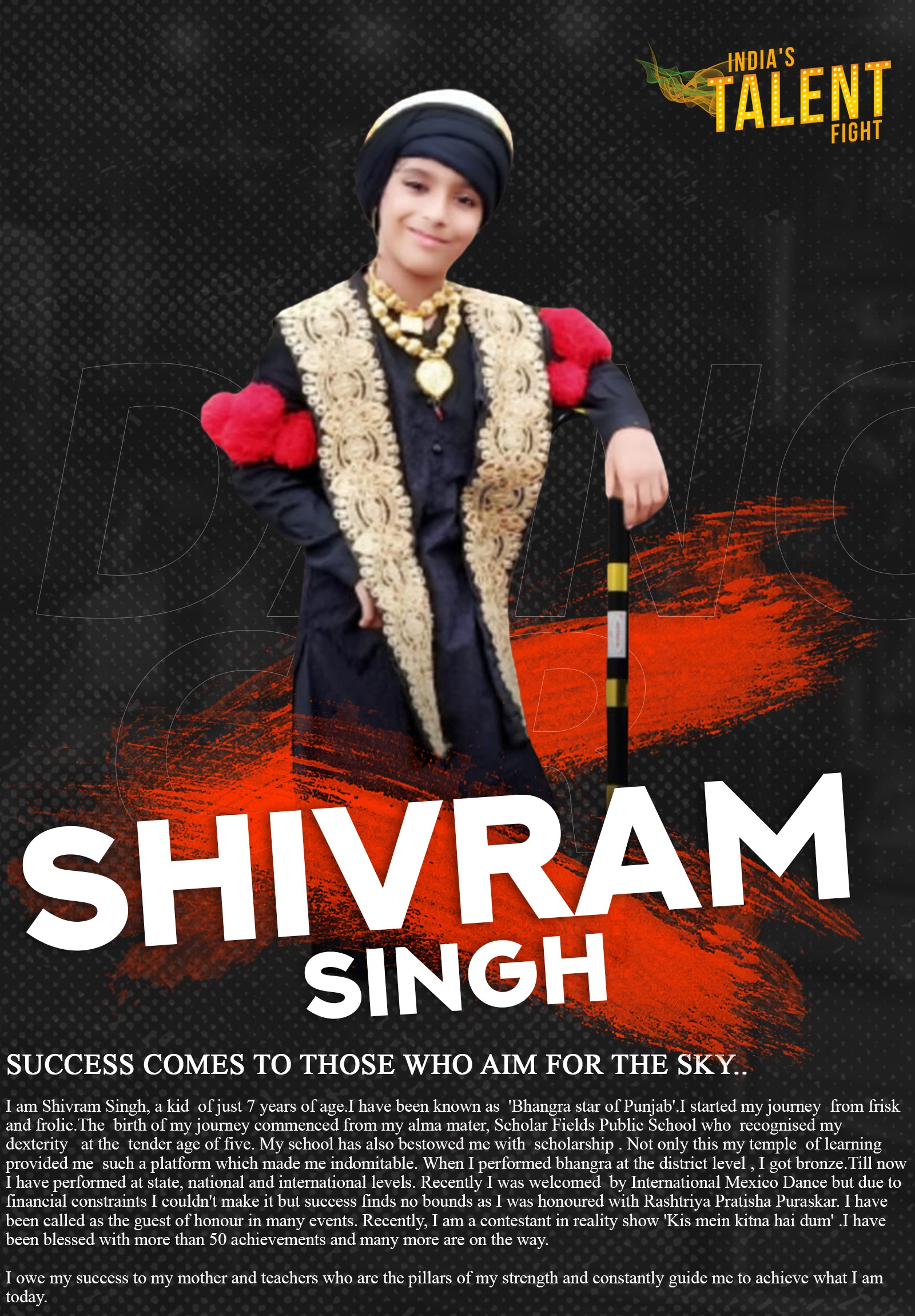 DANCER SHIVRAM SINGH PATIALASuccess comes to those who aim for the sky..I am Shivram Singh, a kid of just 7 years of age.I have been known as ‘Bhangra star of Punjab’.I started my journey from frisk and frolic.The birth of my journey commenced from my alma mater, Scholar Fields Public School who recognised my dexterity at the tender age of five. My school has also bestowed me with scholarship . Not only this my temple