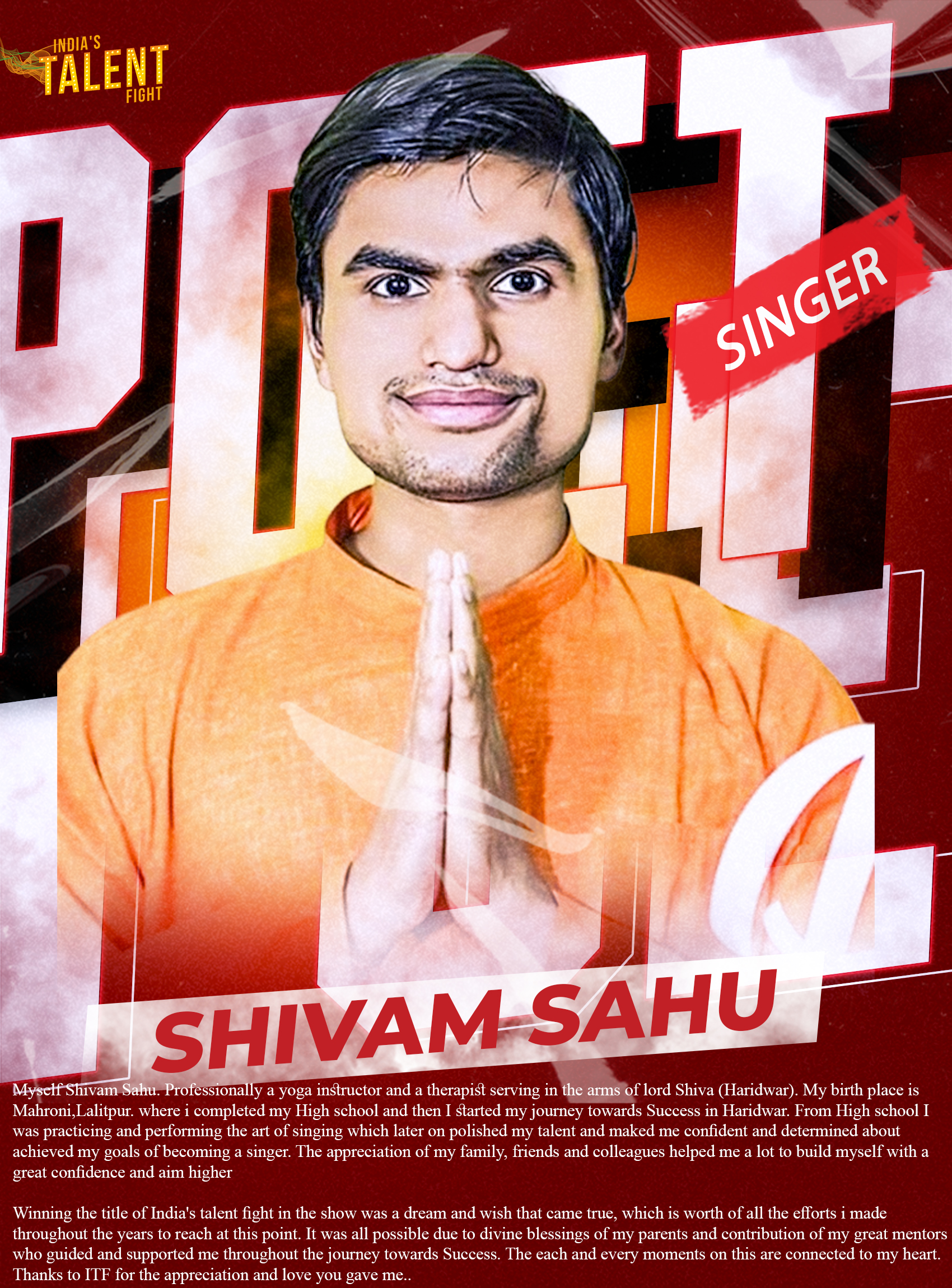 SINGER SHIVAM SAHU HARIDWARThe Road to Success is always under Construction…Don’t wait for opportunities, Create it.Myself Shivam Sahu. Professionally a yoga instructor and a therapist serving in the arms of lord Shiva (Haridwar). My birth place is Mahroni,Lalitpur. where i completed my High school and then I started my journey towards Success in Haridwar. From High school I was practicing and performing the art of singing which later on polished my talent and maked me