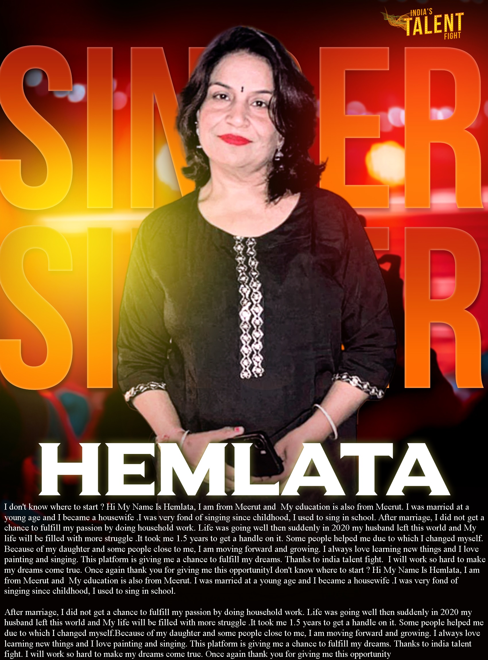 ITF SINGER HEMLATA MEERUTI don’t know where to start ? Hi My Name Is Hemlata, I am from Meerut and My education is also from MeerutI was married at a young age and I became a housewife .I was very fond of singing since childhood, I used to sing in school.After marriage, I did not get a chance to fulfill my passion by doing household work.Life was going well then suddenly in 2020 my husband