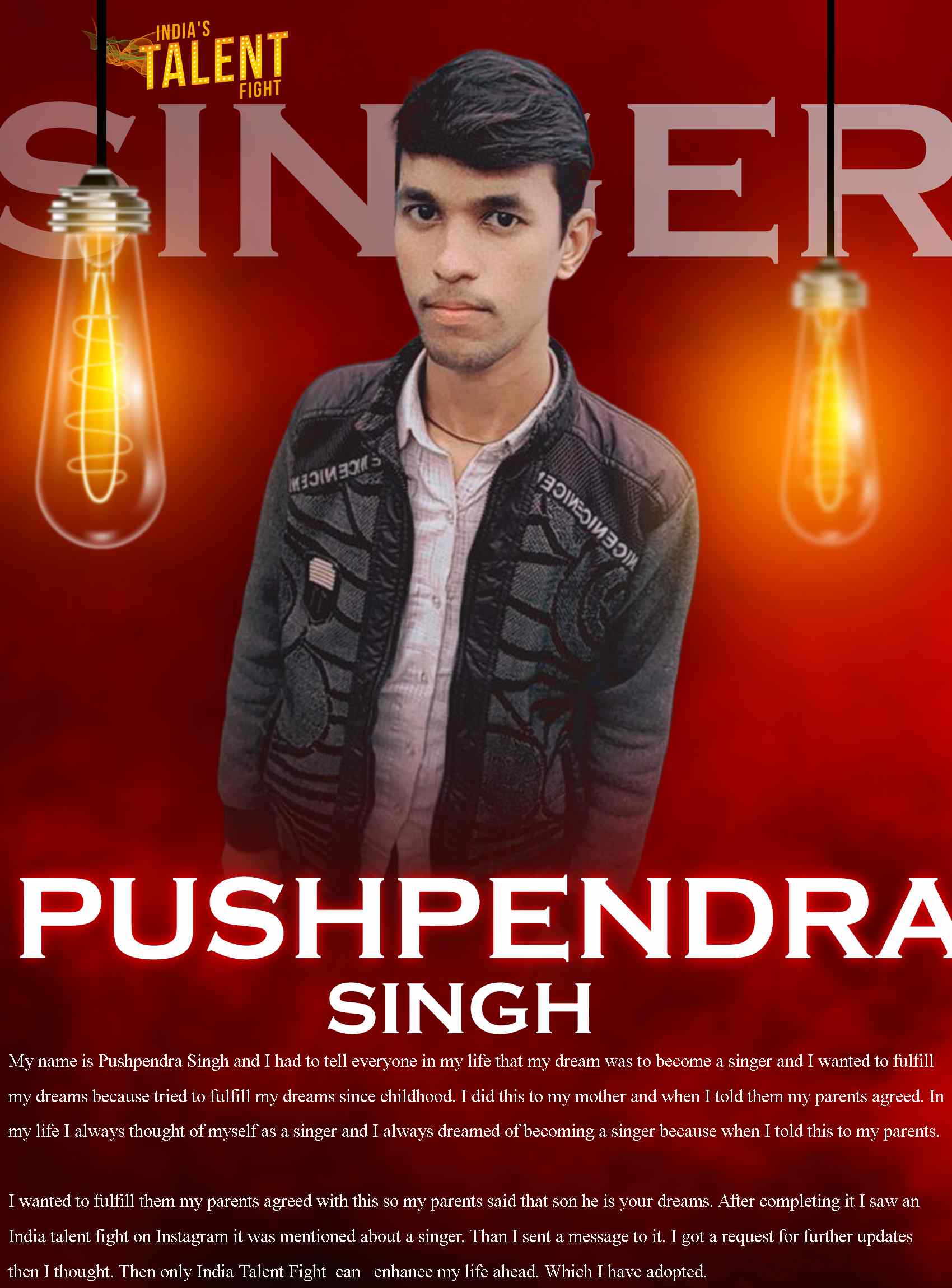 ITF SINGER PUSHPENDRA SINGH CHHATARPURMy name is pushpendra singh. And I had to tell everyone in my life that my dream was to become a singer and I wanted to fulfill my dreams because tried to fulfill my dreams since childhood. I did this to my mother and when I told them my parents agreed. In my life I always thought of myself as a singer and I always dreamed of becoming a singer because