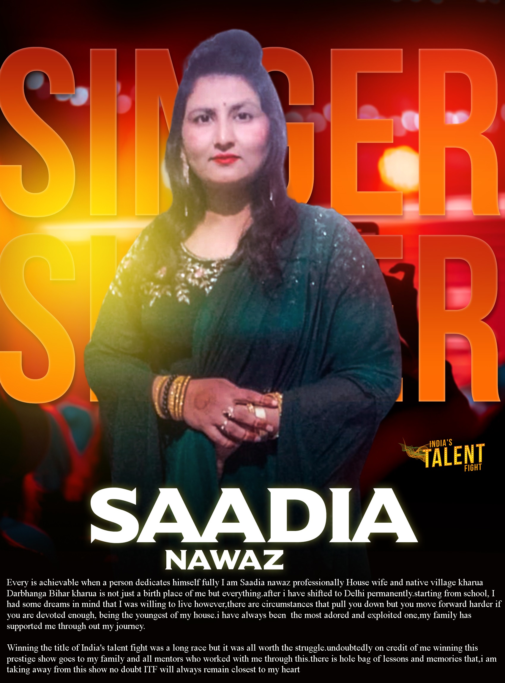 ITF SINGER SAADIA NAWAZ NEW DELHIEvery is achievable when a person dedicates himself fully I am Saadia nawaz professionally House wife and native village kharua Darbhanga Bihar kharua is not just a birth place of me but everything.after i have shifted to Delhi permanently.starting from school, I had some dreams in mind that I was willing to live however,there are circumstances that pull you down but you move forward harder if you are devoted enough,