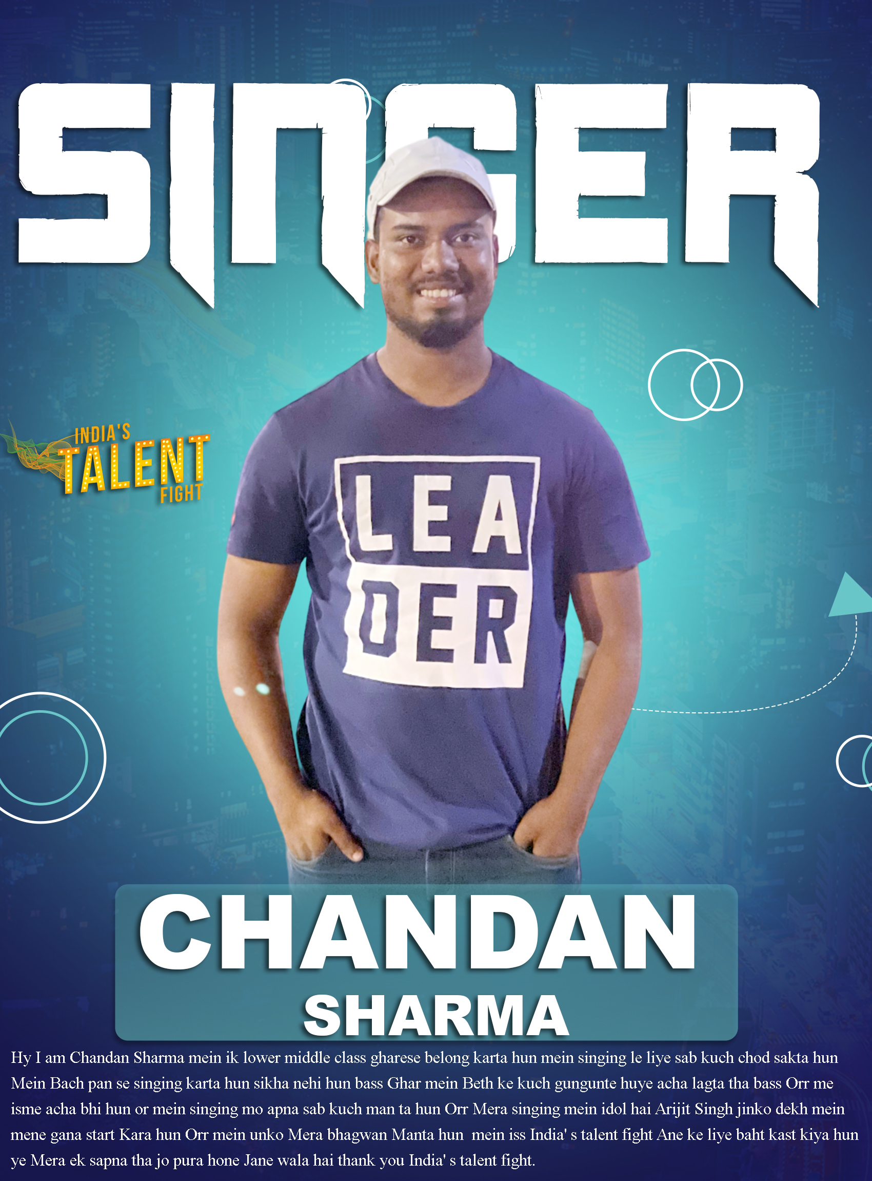 SINGER CHANDAN SHARMA BHUBANESHWARHy I am Chandan Sharma mein ik lower middle class gharese belong karta hun mein singing le liye sab kuch chod sakta hun Mein Bach pan se singing karta hun sikha nehi hun bass Ghar mein Beth ke kuch gungunte huye acha lagta tha bass Orr me isme acha bhi hun or mein singing mo apna sab kuch man ta hun Orr Mera singing mein idol hai Arijit Singh jinko dekh mein