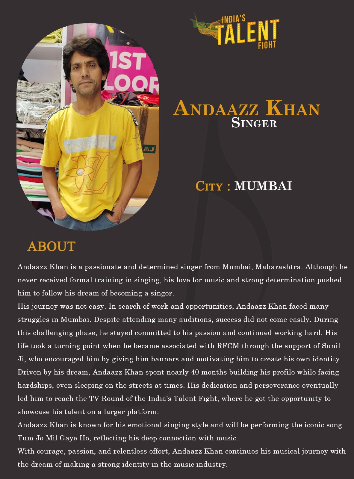 ITF Singer Andaazz khan mumbaiAndaazz Khan is a passionate and determined singer from Mumbai, Maharashtra. Although he never received formal training in singing, his love for music and strong determination pushed him to follow his dream of becoming a singer.His journey was not easy. In search of work and opportunities, Andaazz Khan faced many struggles in Mumbai. Despite attending many auditions, success did not come easily. During this challenging phase, he stayed committed to his