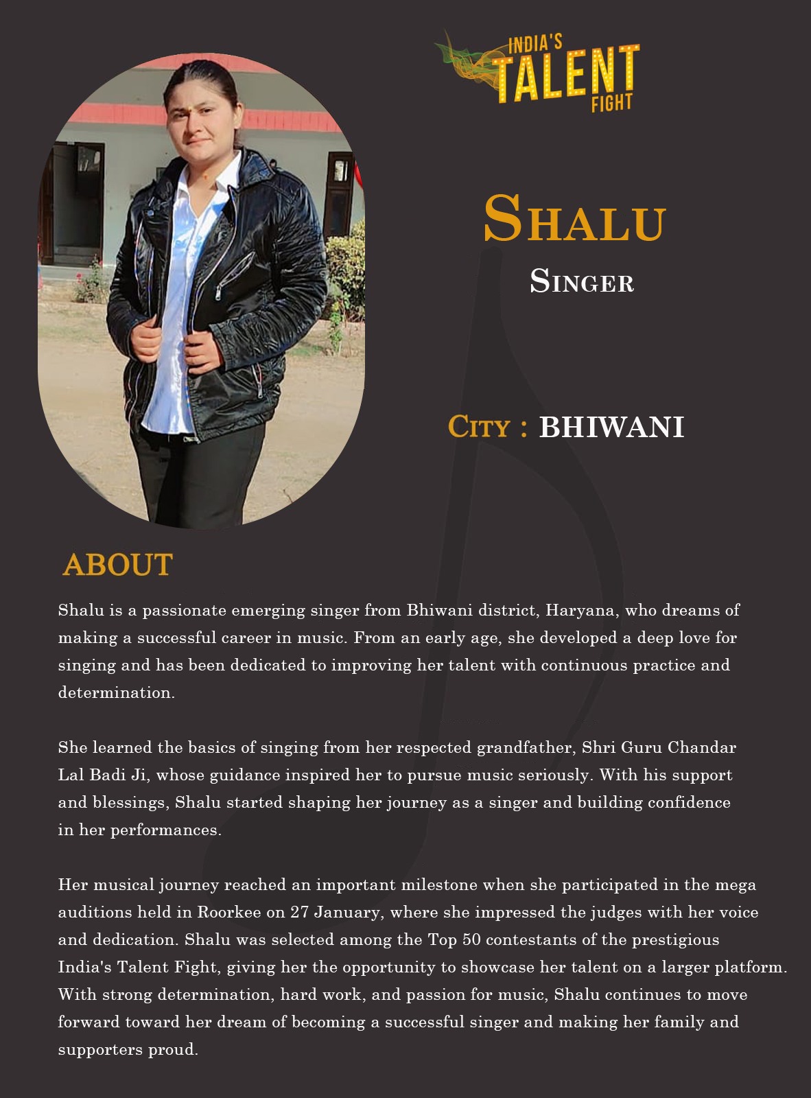 ITF Singer Shalu BhiwaniShalu is a passionate emerging singer from Bhiwani district, Haryana, who dreams of making a successful career in music. From an early age, she developed a deep love for singing and has been dedicated to improving her talent with continuous practice and determination.She learned the basics of singing from her respected grandfather, Shri Guru Chandar Lal Badi Ji, whose guidance inspired her to pursue music seriously. With his support and blessings, Shalu