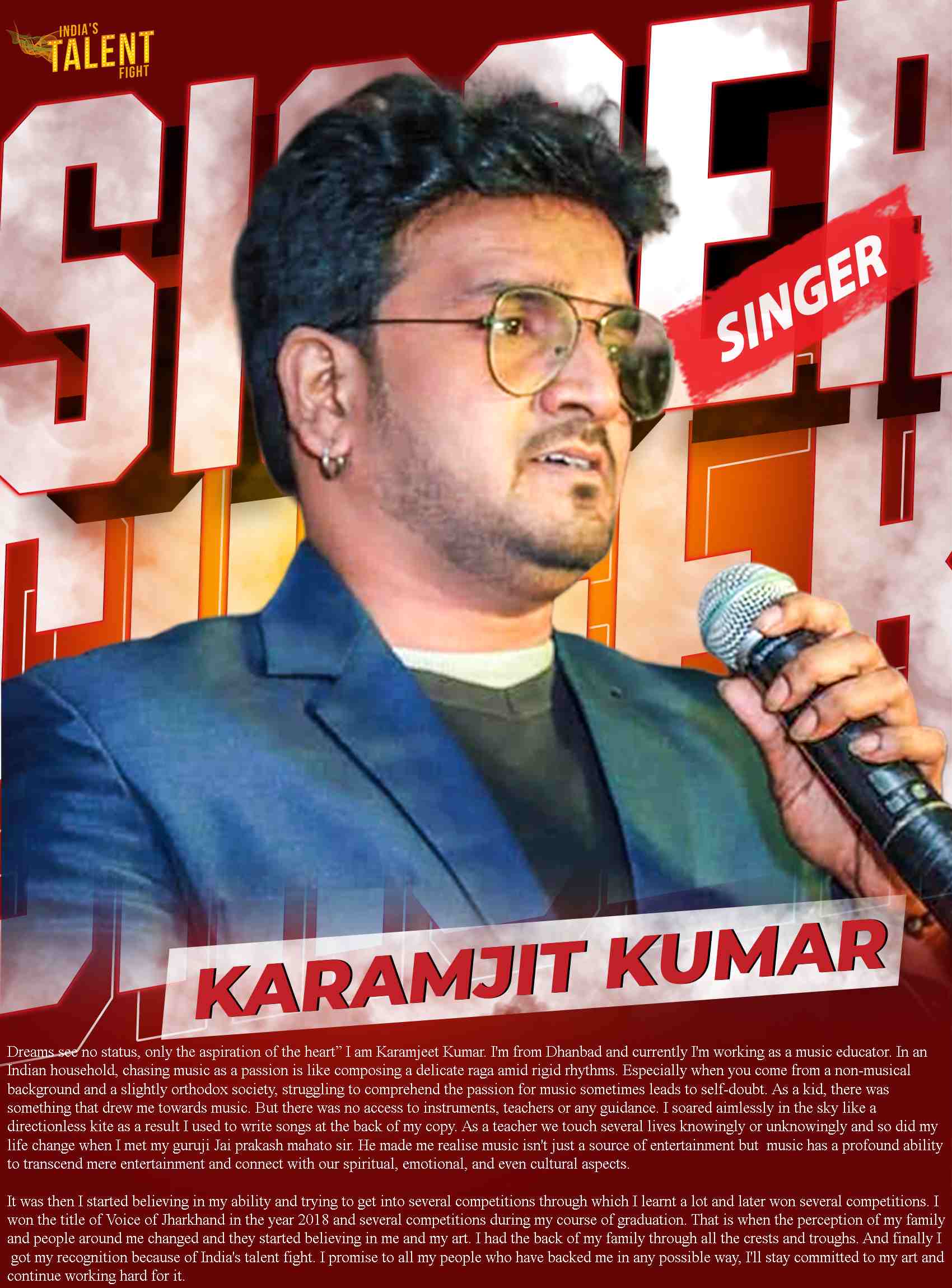SINGER KARAMJIT KUMAR DHANBAD“Dreams see no status, only the aspiration of the heart” I am Karamjeet Kumar. I’m from Dhanbad and currently I’m working as a music educator. In an Indian household, chasing music as a passion is like composing a delicate raga amid rigid rhythms. Especially when you come from a non-musical background and a slightly orthodox society, struggling to comprehend the passion for music sometimes leads to self-doubt.As a kid, there was something