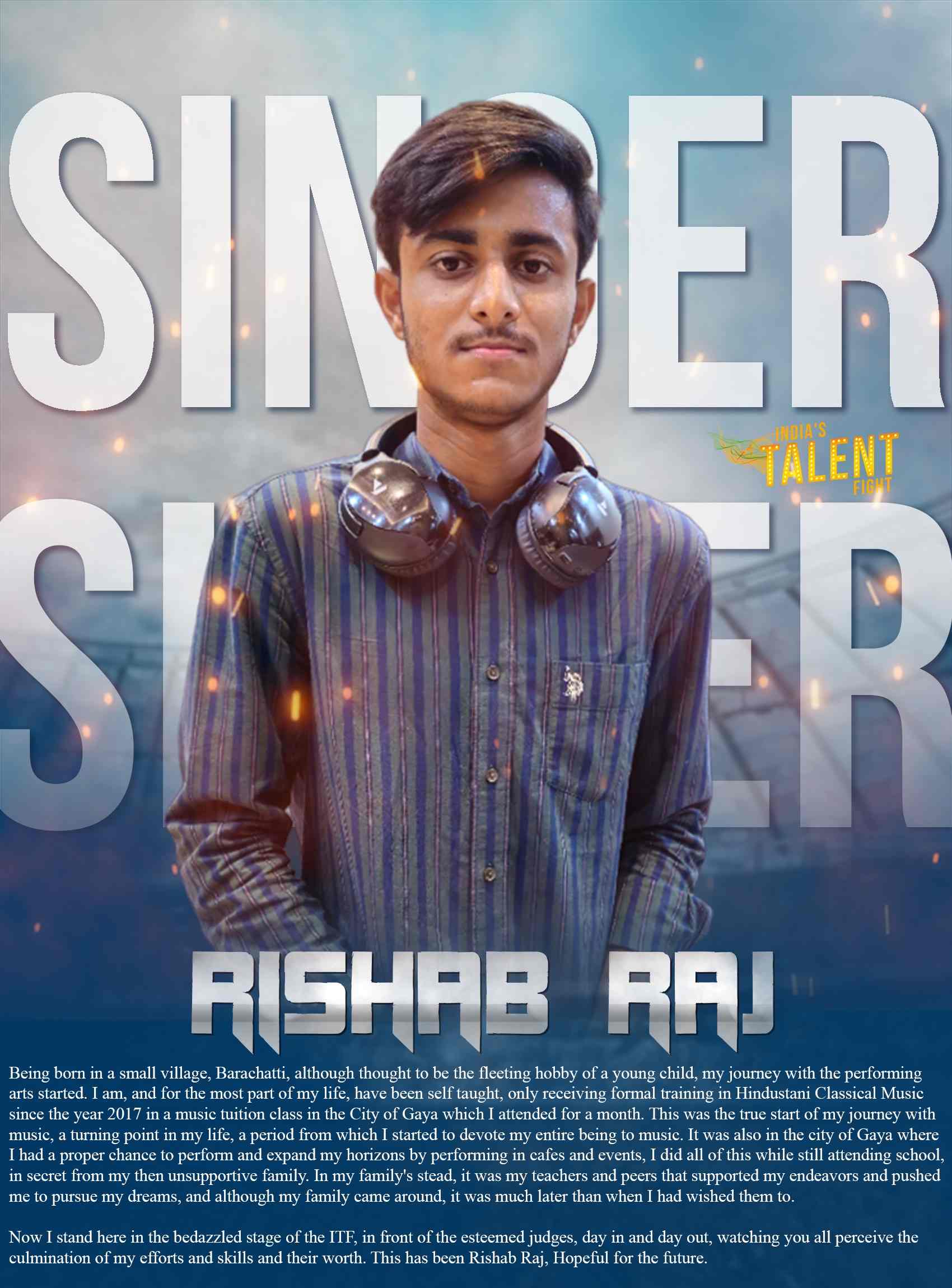 ITF SINGER RISHAB RAJ GAYA BIHARBeing born in a small village, Barachatti, although thought to be the fleeting hobby of a young child, my journey with the performing arts started.I am, and for the most part of my life, have been self taught, only receiving formal training in Hindustani Classical Music since the year 2017 in a music tuition class in the City of Gaya which I attended for a month.This was the true start