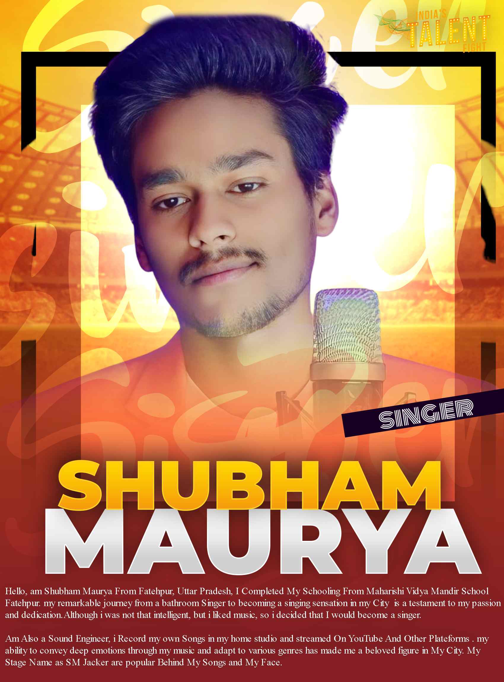 SINGER SHUBHAM MAURYA FATEHPURHello, am Shubham Maurya From Fatehpur, Uttar Pradesh, I Completed My Schooling From Maharishi Vidya Mandir School Fatehpur. my remarkable journey from a bathroom Singer to becoming a singing sensation in my City is a testament to my passion and dedication.Although i was not that intelligent, but i liked music, so i decided that I would become a singer.Am Also a Sound Engineer, i Record my own Songs in my home studio