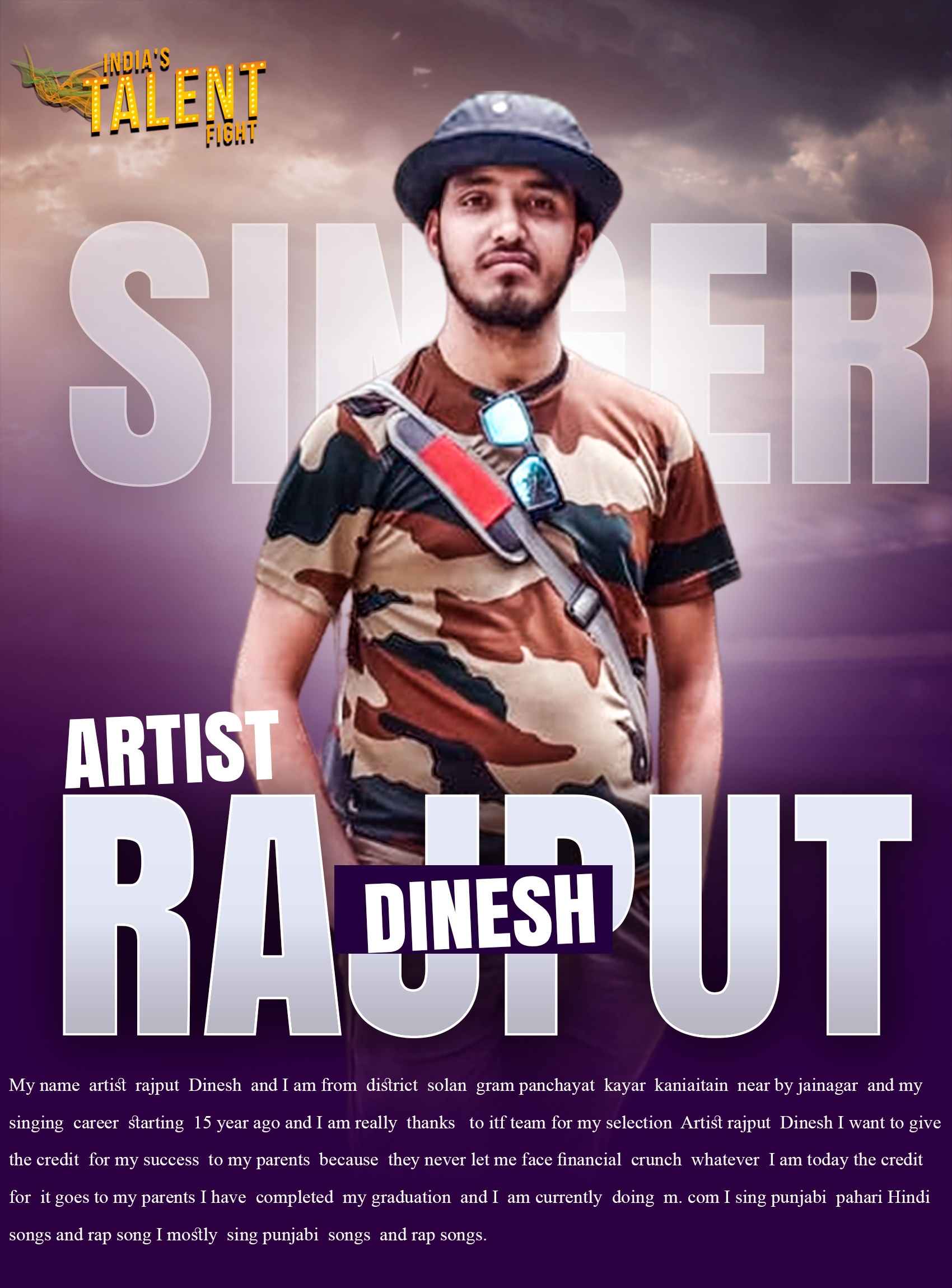 ITF Singer Artist Rajput Dinesh SolanMy name artist rajput Dinesh and I am from district solan gram panchayat kayar kaniaitain near by jainagar and my singing career starting 15 year ago and I am really thanks to itf team for my selection Artist rajput Dinesh I want to give the credit for my success to my parents because they never let me face financial crunch whatever I am today the credit for it goes to