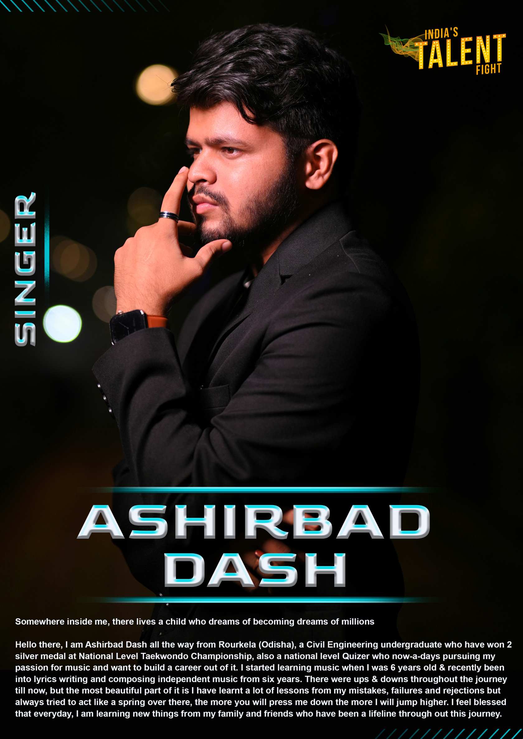 SINGER ASHIRBAD DASH ROURKELA ODISHASomewhere inside me, there lives a child who dreams of becoming dreams of millionsHello there, I am Ashirbad Dash all the way from Rourkela (Odisha), a Civil Engineering undergraduate who have won 2 silver medal at National Level Taekwondo Championship, also a national level Quizer who now-a-days pursuing my passion for music and want to build a career out of it. I started learning music when I was 6 years old