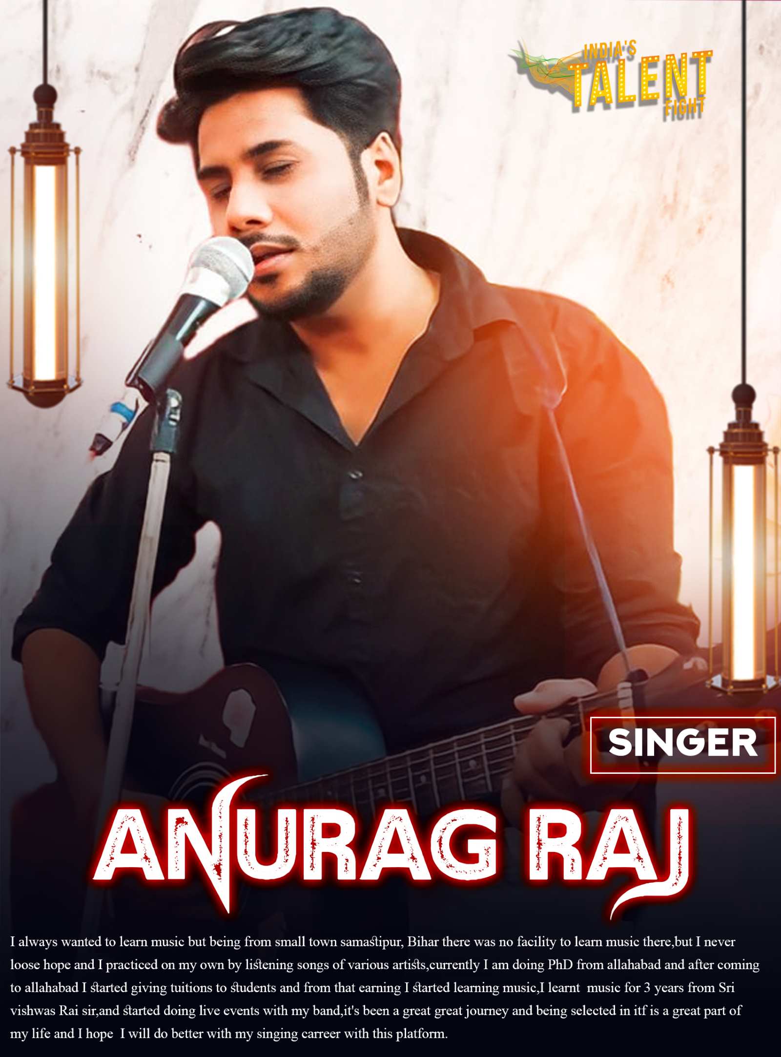 SINGER ANURAG RAJ SAMASTIPURI always wanted to learn music but being from small town samastipur, Bihar there was no facility to learn music there,but I never loose hope and I practiced on my own by listening songs of various artists,currently I am doing PhD from allahabad and after coming to allahabad I started giving tuitions to students and from that earning I started learning music,I learnt music for 3 years from Sri vishwas Rai sir,and