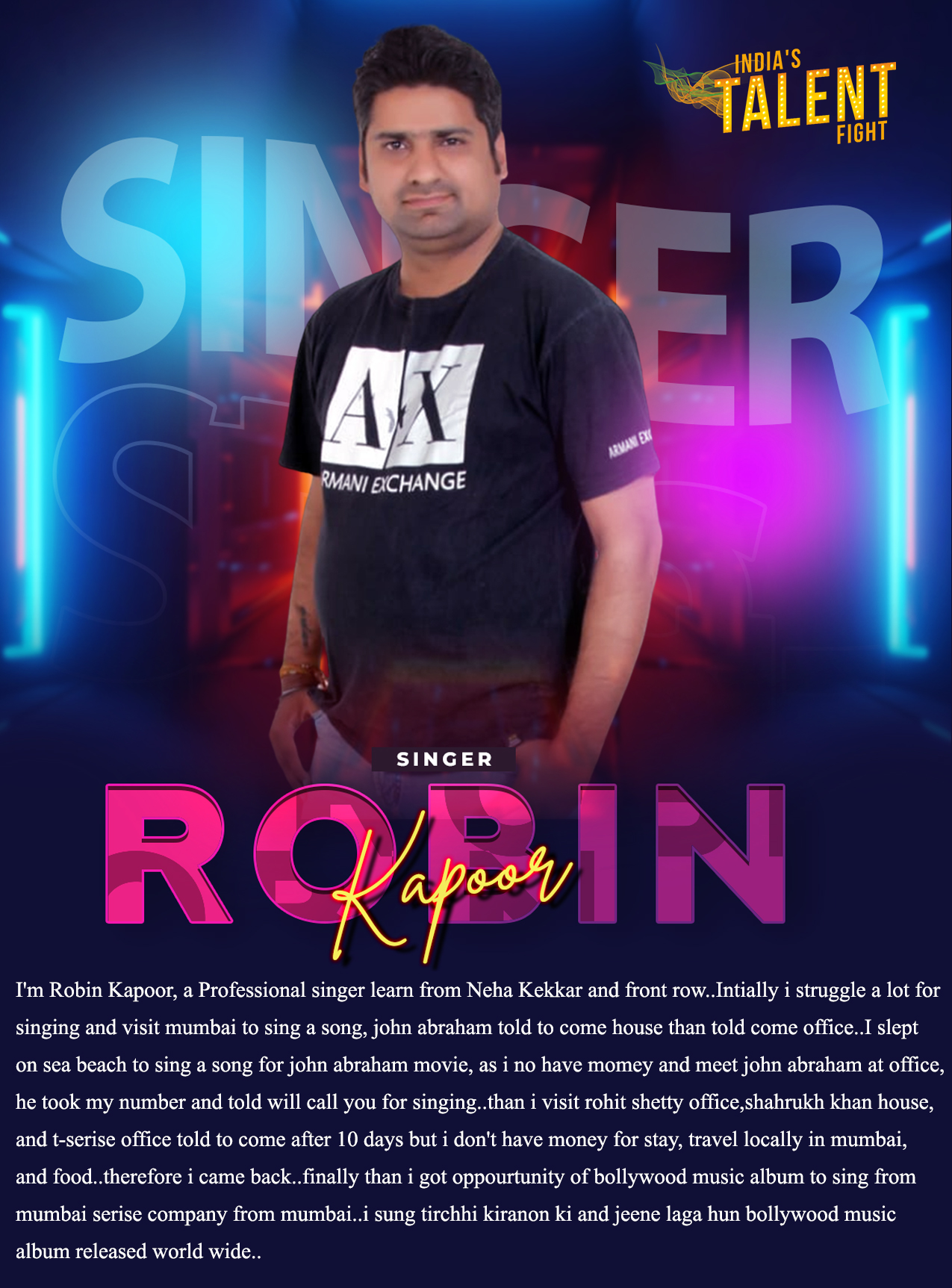 SINGER ROBIN KAPOOR AHMEDABADI’m Robin Kapoor, a Professional singer learn from Neha Kekkar and front row..Intially i struggle a lot for singing and visit mumbai to sing a song, john abraham told to come house than told come office..I slept on sea beach to sing a song for john abraham movie, as i no have momey and meet john abraham at office, he took my number and told will call you for singing..than i visit