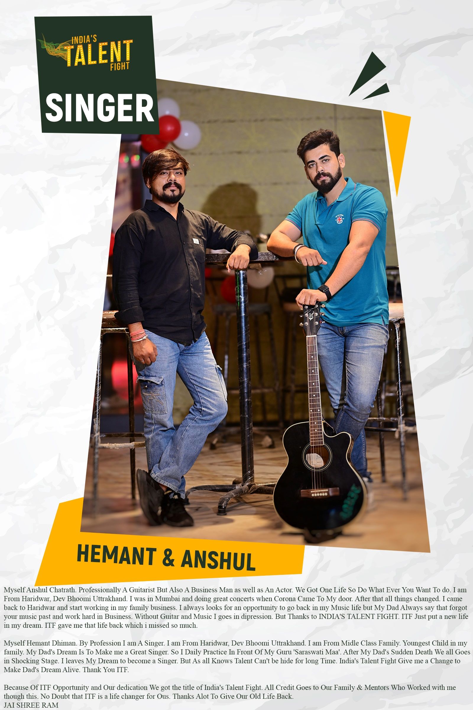 SINGER HEMANT & ANSHUL HARIDWAR‘Never dreamed about success. Just worked for it.’Anshul & HemantMyself Anshul Chatrath. Professionally A Guitarist But Also A Business Man as well as An Actor. We Got One Life So Do What Ever You Want To do. I am From Haridwar, Dev Bhoomi Uttrakhand. I was in Mumbai and doing great concerts when Corona Came To My door. After that all things changed. I came back to Haridwar and start working