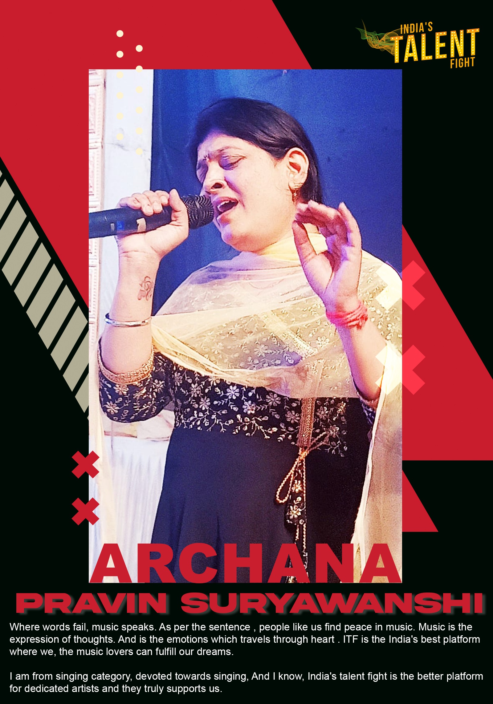 SINGER ARCHANA PRAVIN SURYAWANSHI NASHIKWhere words fail, music speaks. As per the sentence , people like us find peace in music. Music is the expression of thoughts. And is the emotions which travels through heart .ITF is the India’s best platform where we, the music lovers can fulfill our dreams.I am from singing category, devoted towards singing, And I know, India’s talent fight is the better platform for dedicated artists and they truly supports us