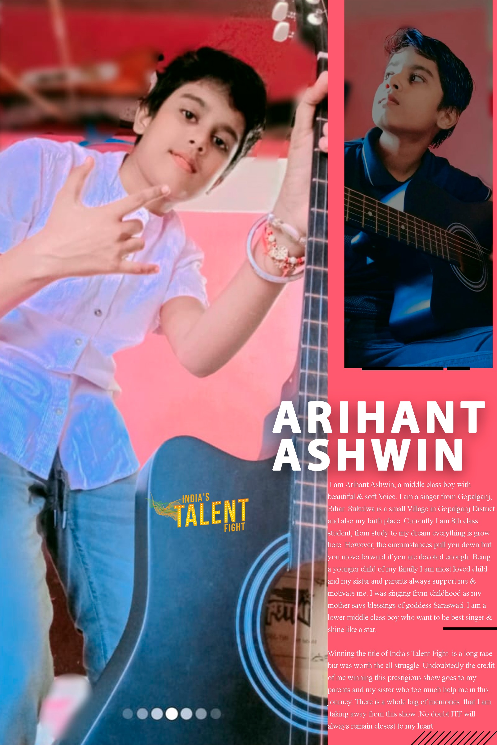 SINGER ARIHANT ASHWIN GOPALGANJ I am Arihant Ashwin, a middle class boy with beautiful & soft Voice. I am a singer from Gopalganj, Bihar. Sukulwa is a small Village in Gopalganj District and also my birth place. Currently I am 8th class student, from study to my dream everything is grow here. However, the circumstances pull you down but you move forward if you are devoted enough. Being a younger child of my family I