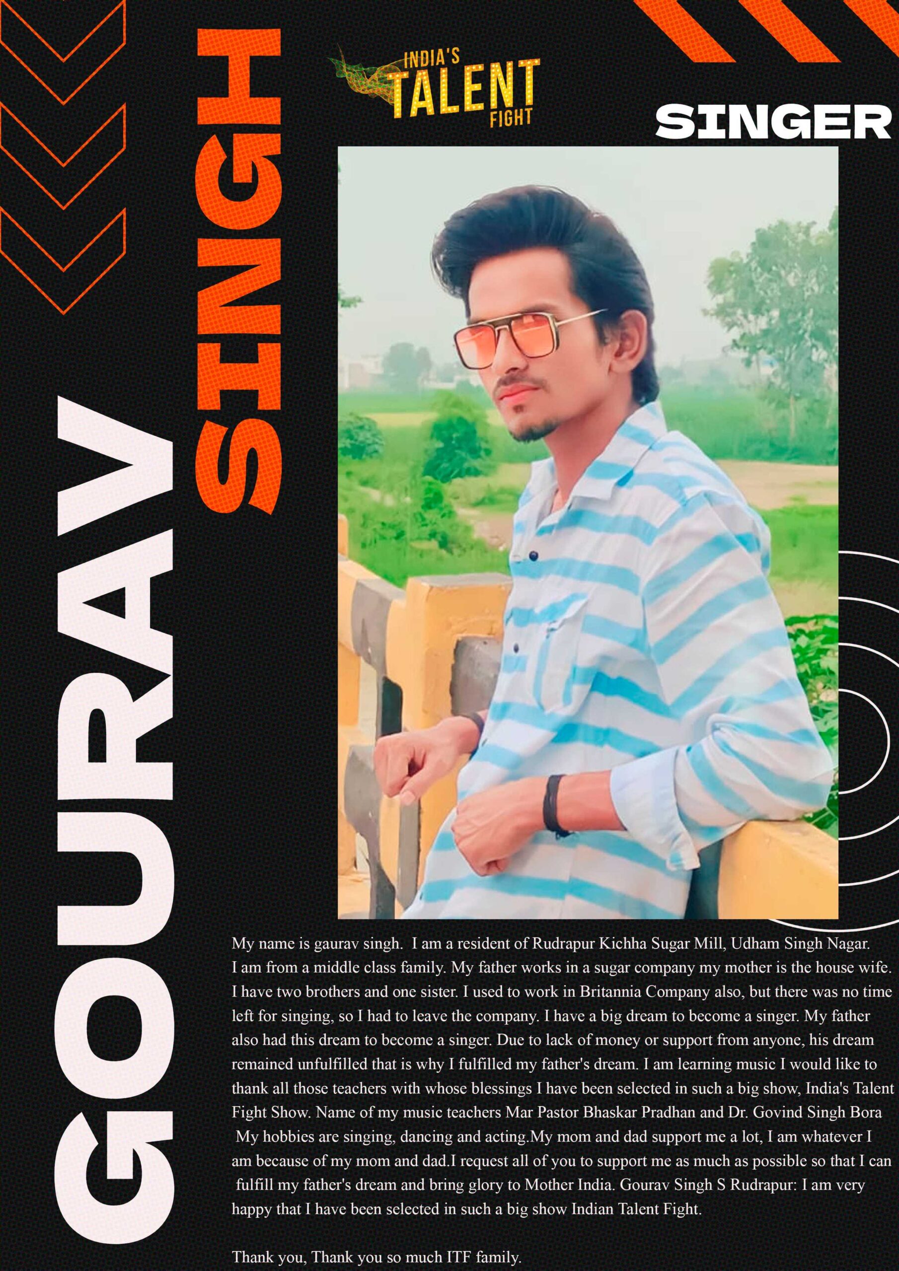 SINGER GOURAV SINGH KICHHA UDHAM SINGH NAGARmy name is gaurav singhI am a resident of Rudrapur Kichha Sugar Mill, Udham Singh Nagar.I am from a middle class familyMy father works in a sugar companymy mother is the house wifeI have two brothers and one sisterI used to work in Britannia Company also, but there was no time left for singing, so I had to leave the companyI have a big dream to become a singer.